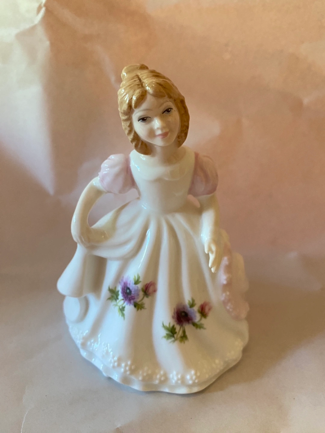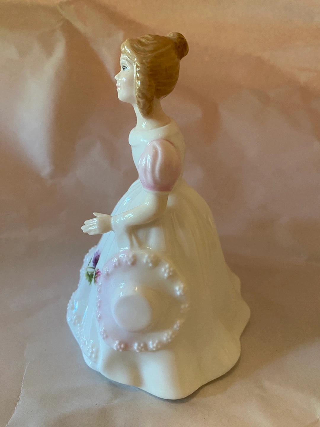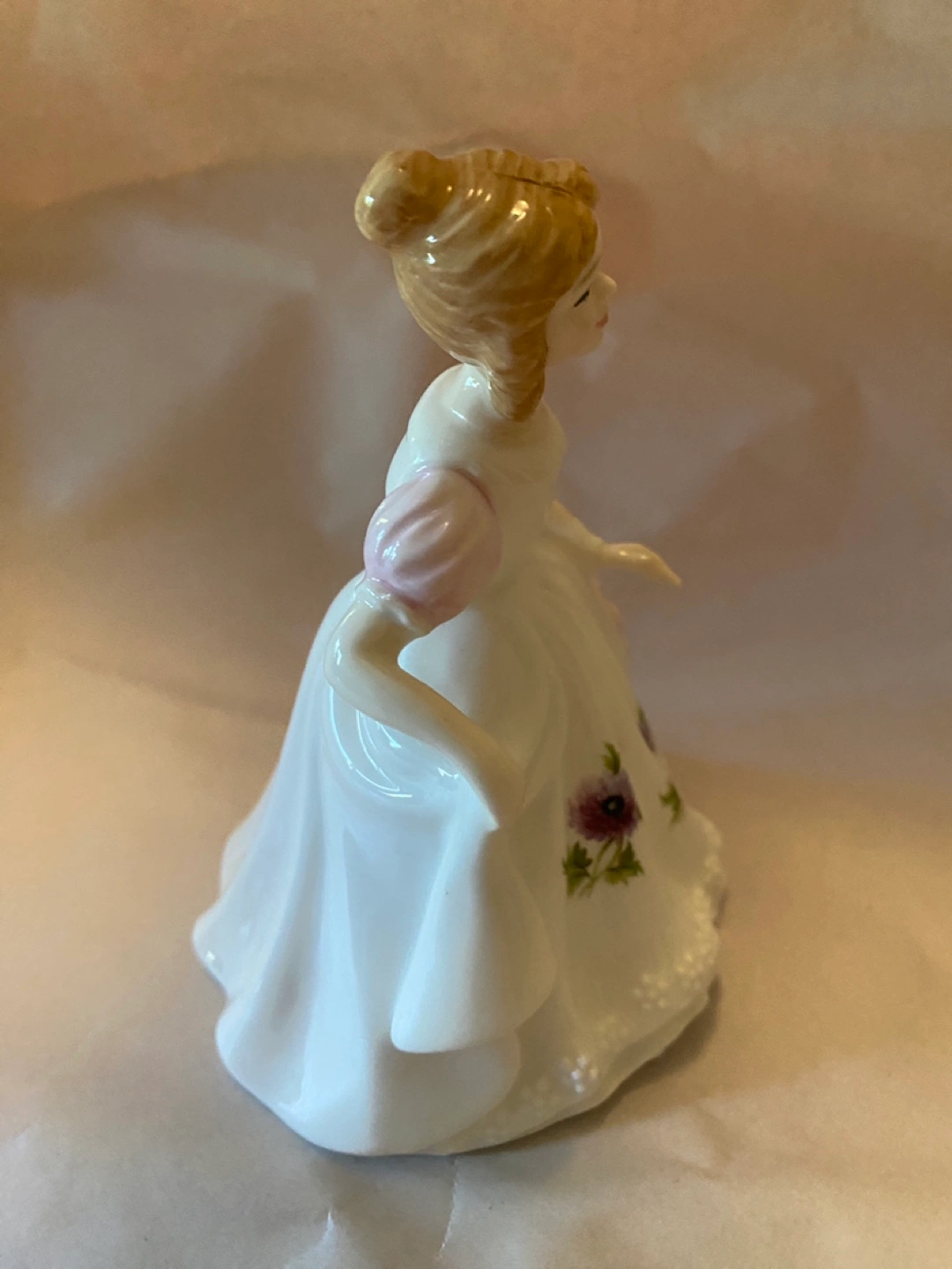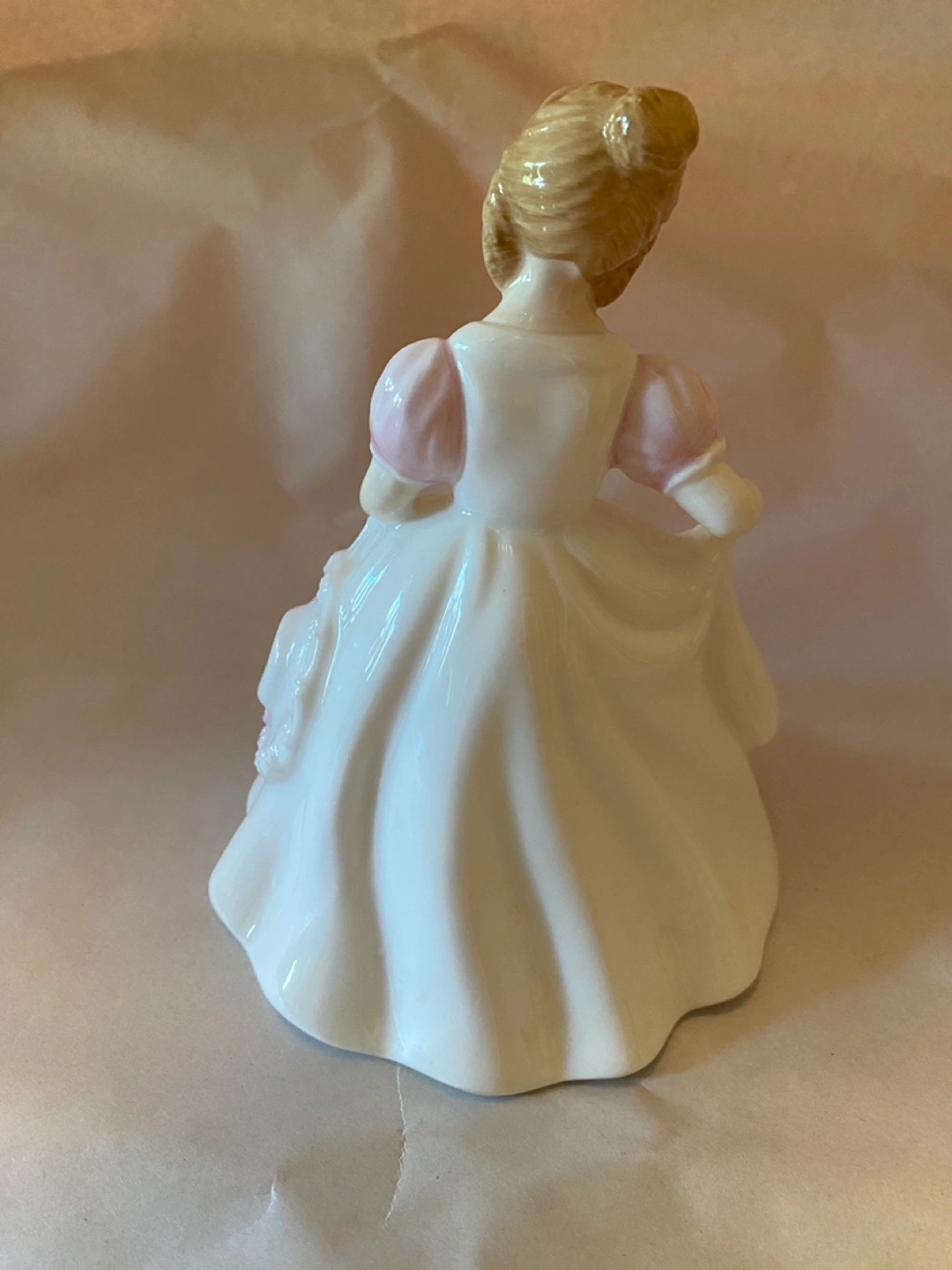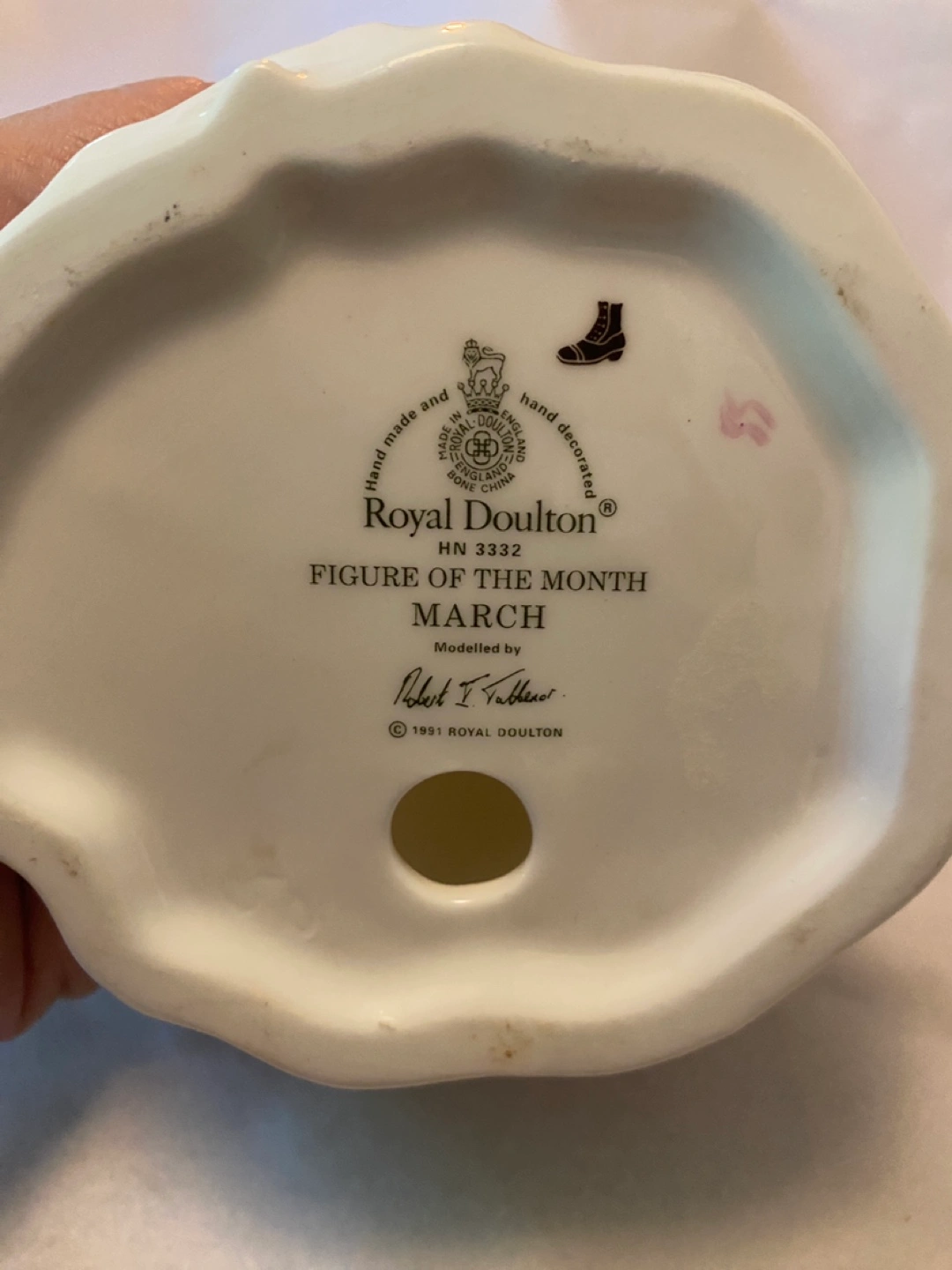 Manufacturer: Royal Doulton Series: Figure of the Month Month: March Model Number: HN 3332 Modeller: Robert T. Taberner Copyright Year: 1991 Royal Doulton Description: The figurine depicts a young woman in a white gown with light pink puffed sleeves. Her hair is styled in an updo. The front of her dress is adorned with purple and maroon floral designs. She is holding a light pink hat with white decorative elements. Height: 5.25 inches.