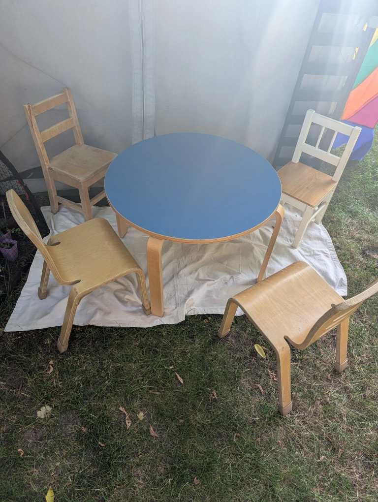 A set of kids' table and chairs. Includes a round blue table. Comes with multiple wooden chairs. These pieces would be a great addition to a child's play area. Has wear and tear, as shown in photos. Pick up by Keele and Rogers Cash only
