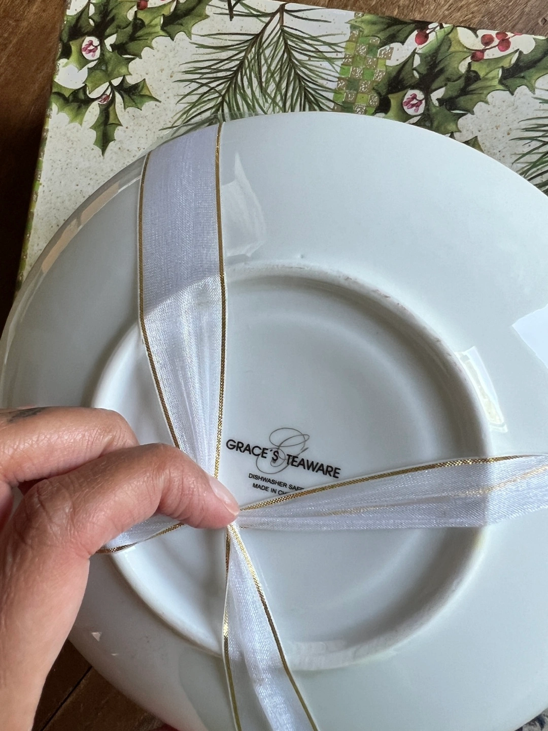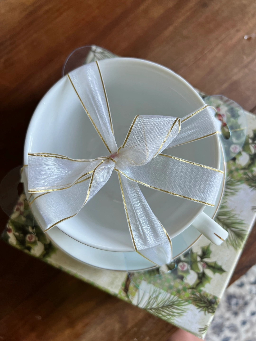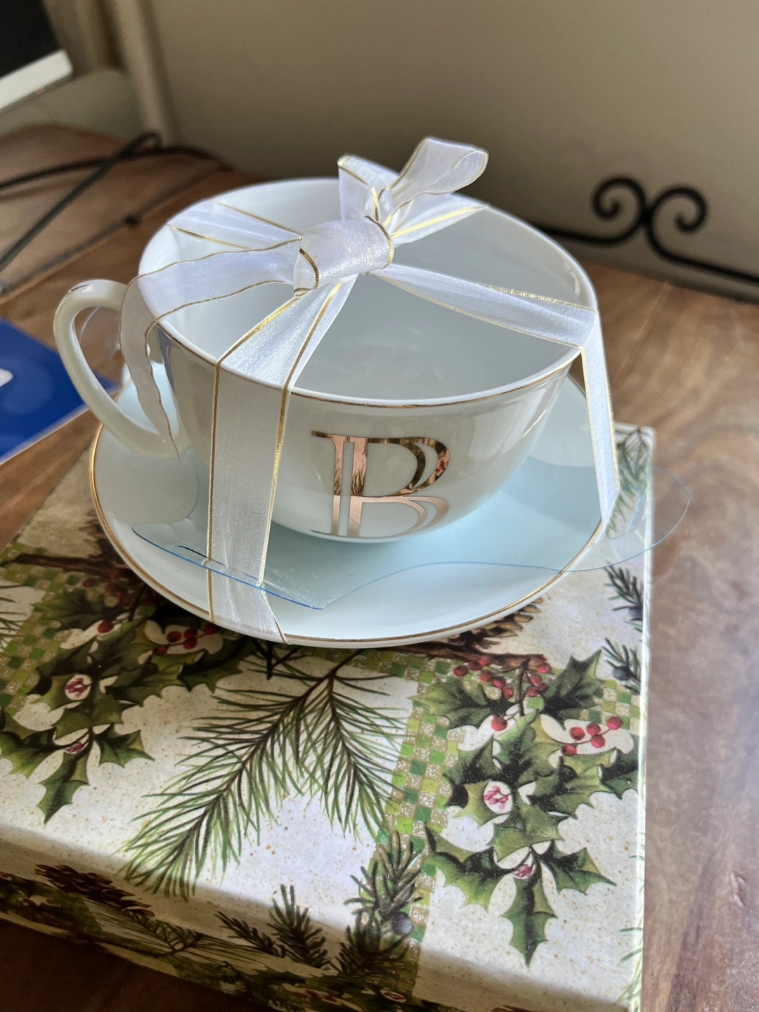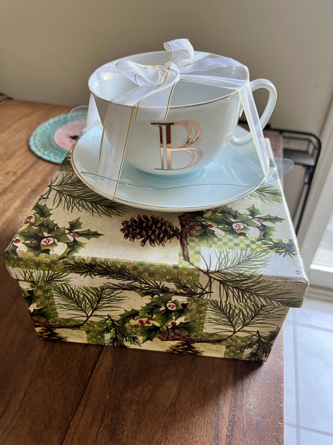 New - still packaged with bow. 6-8oz cup with saucer. Letter B on it. Dishwasher safe as stamped on the bottom. Gifted to my mom but she doesn’t want it. Gift box included.