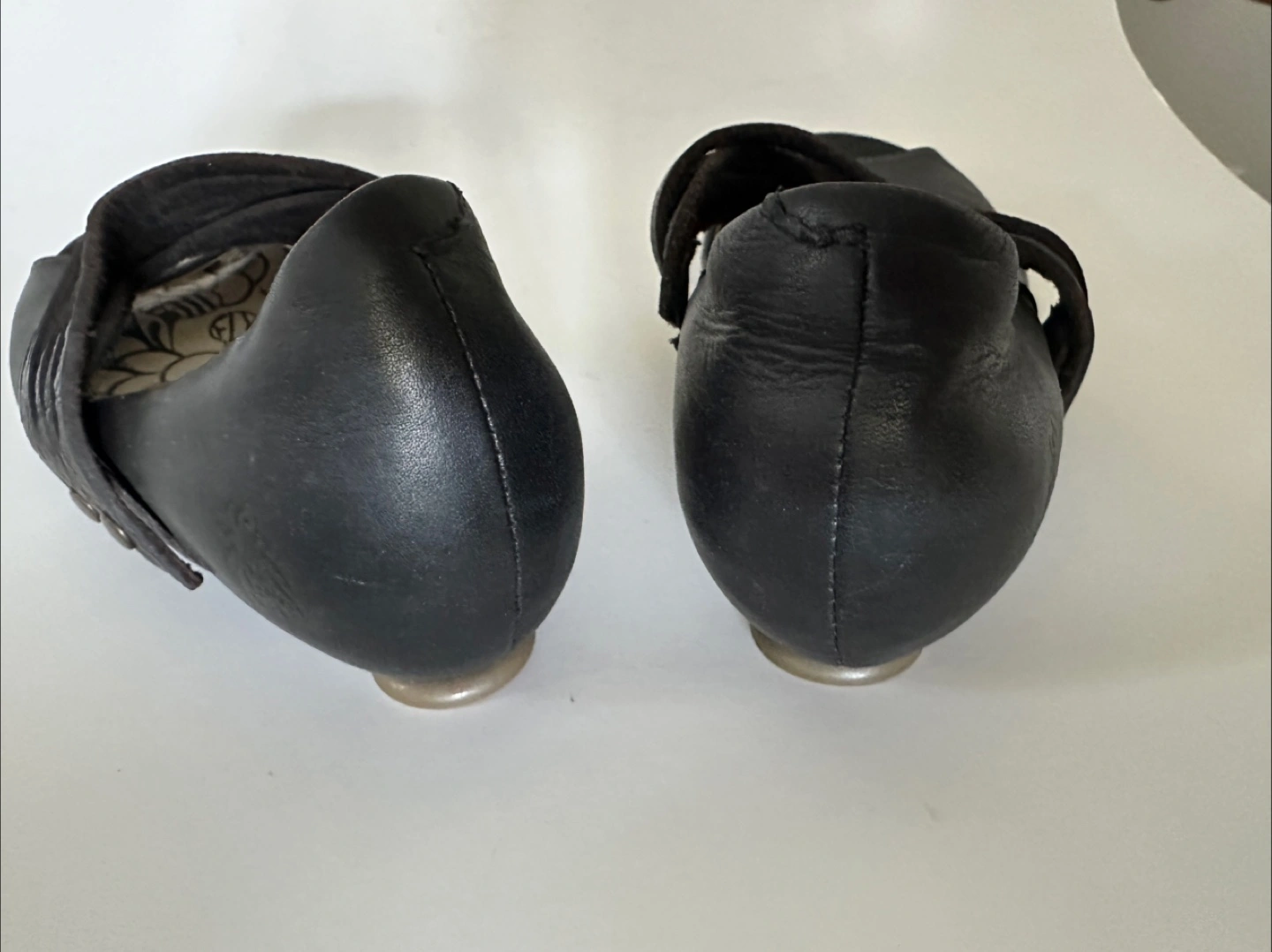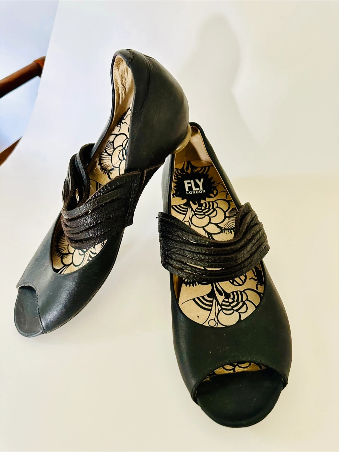 FLY London Black leather flats with an open toe. Decorated with straps across the top. A perfect choice for a relaxing evening out. Size 5 In excellent pre-loved condition These shoes have been meticulously cleaned and sanitized. From a smoke free, pet free home. Pick up in Alta Vista.