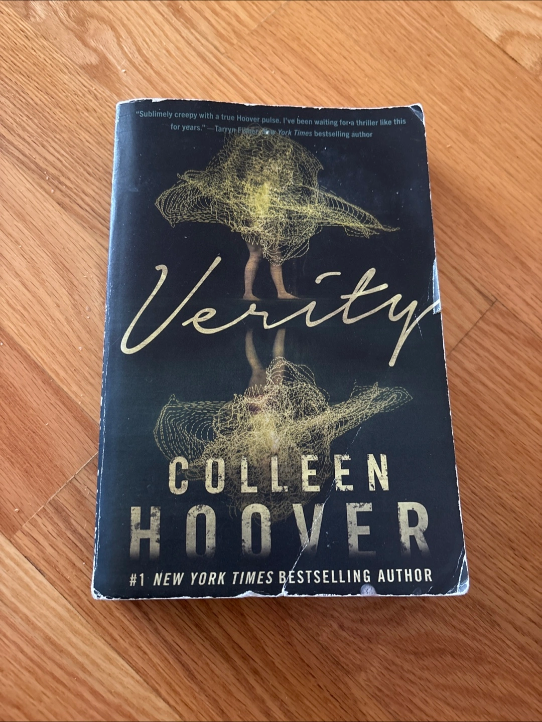The book cover features a black background. Gold text reads "Verity". Author's name is listed as Colleen Hoover. Book has some wear along the edges. Take some time to dive into this read, it will be well worth your time.
