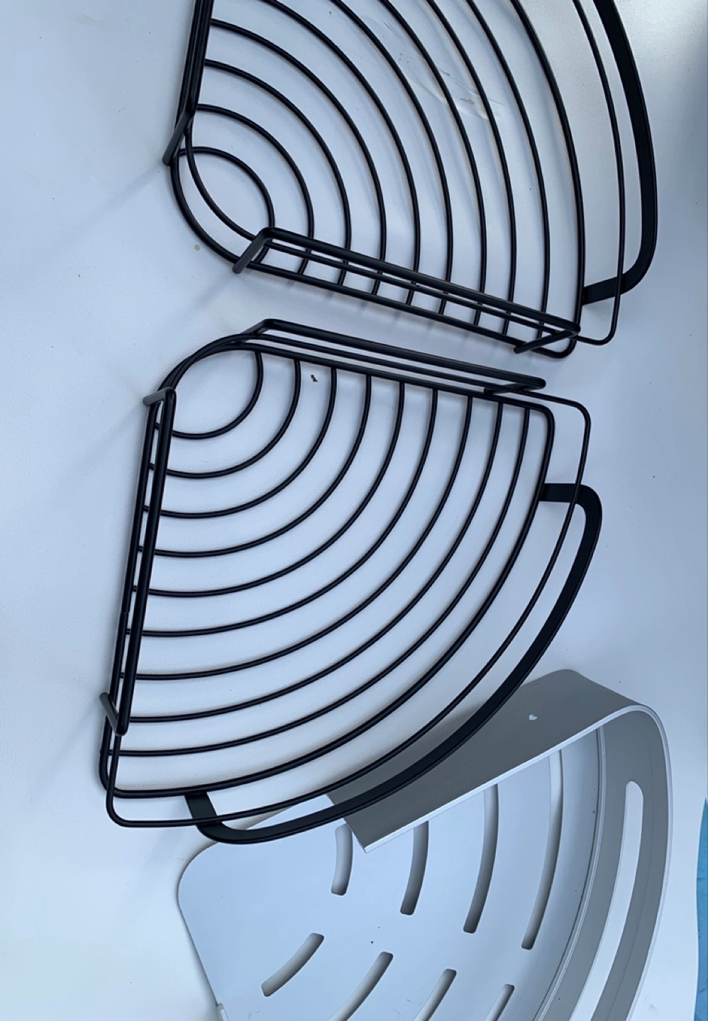 Shower shelves in a corner design. Black wire shelves, two are corner-shaped. Includes a smaller, rounded shelf. These shelves are wonderful for providing extra space in your shower for your comfort.