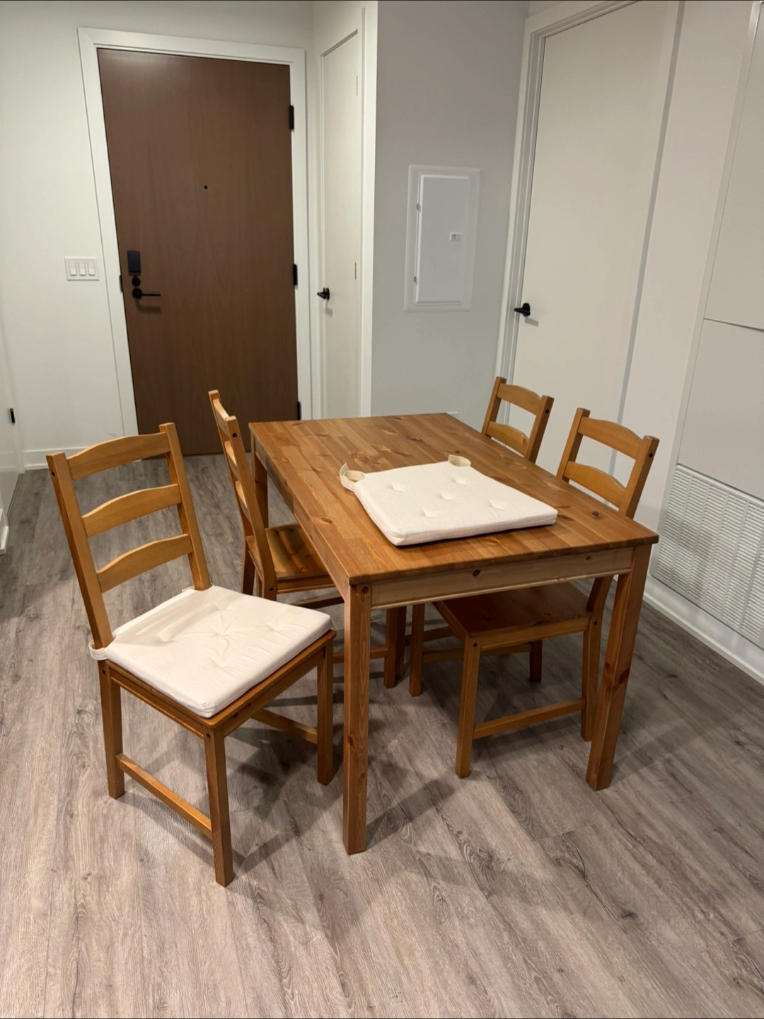 A beautiful wooden dining table. Includes four matching chairs! ๐ช And cushions as well. :) Actual price on IKEA is $230 plus whatever we paid for the cushions.