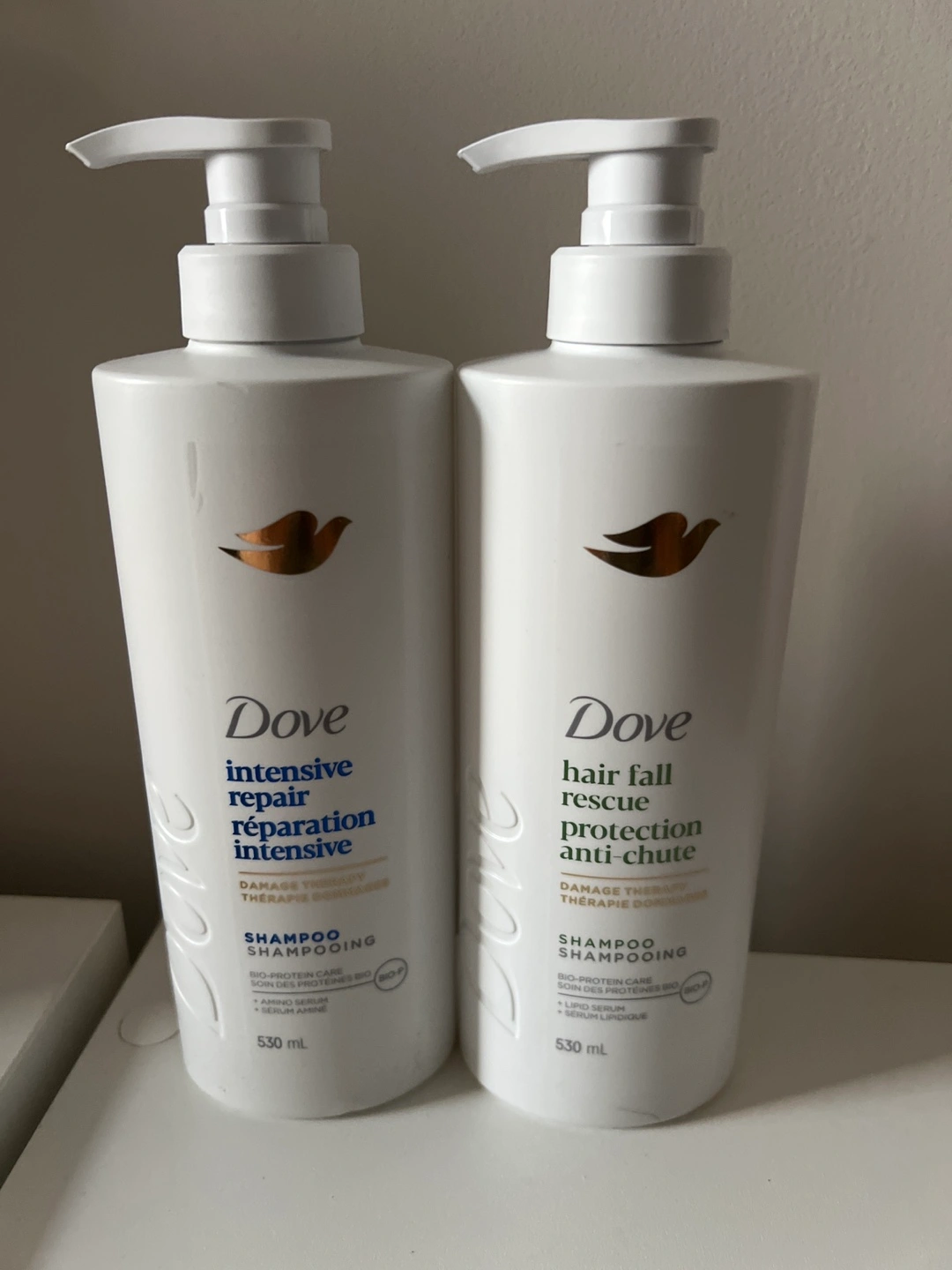 Two white shampoo bottles with pump dispensers. Features the Dove logo. One bottle is for intensive repair, and the other is for hair fall rescue. These shampoos could offer you a relaxing experience, as you gently cleanse your hair. $6 each or $10 For both