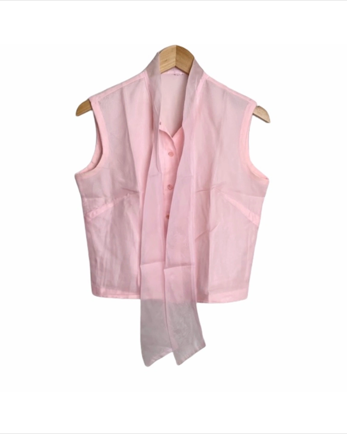 Thrift store find vintage pale pink tie front top. Semi sheer, nude bra definitely recommended. Looks very chic.