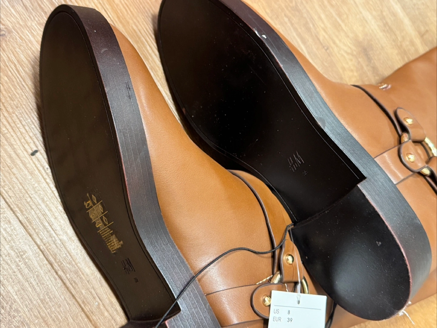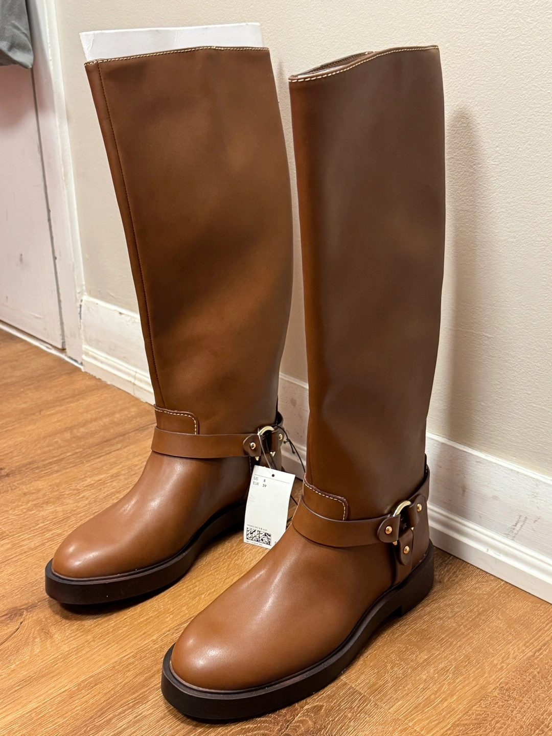 Brown, knee-high boots. Features gold accents on the ankle strap. The boots have a round toe. You will love walking in these on a cool day. Real price $114 without tax included