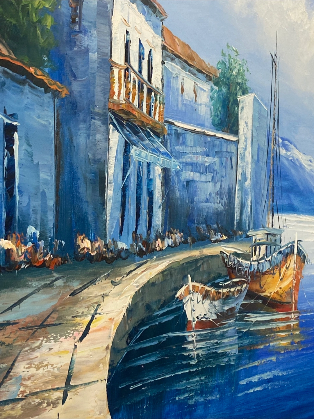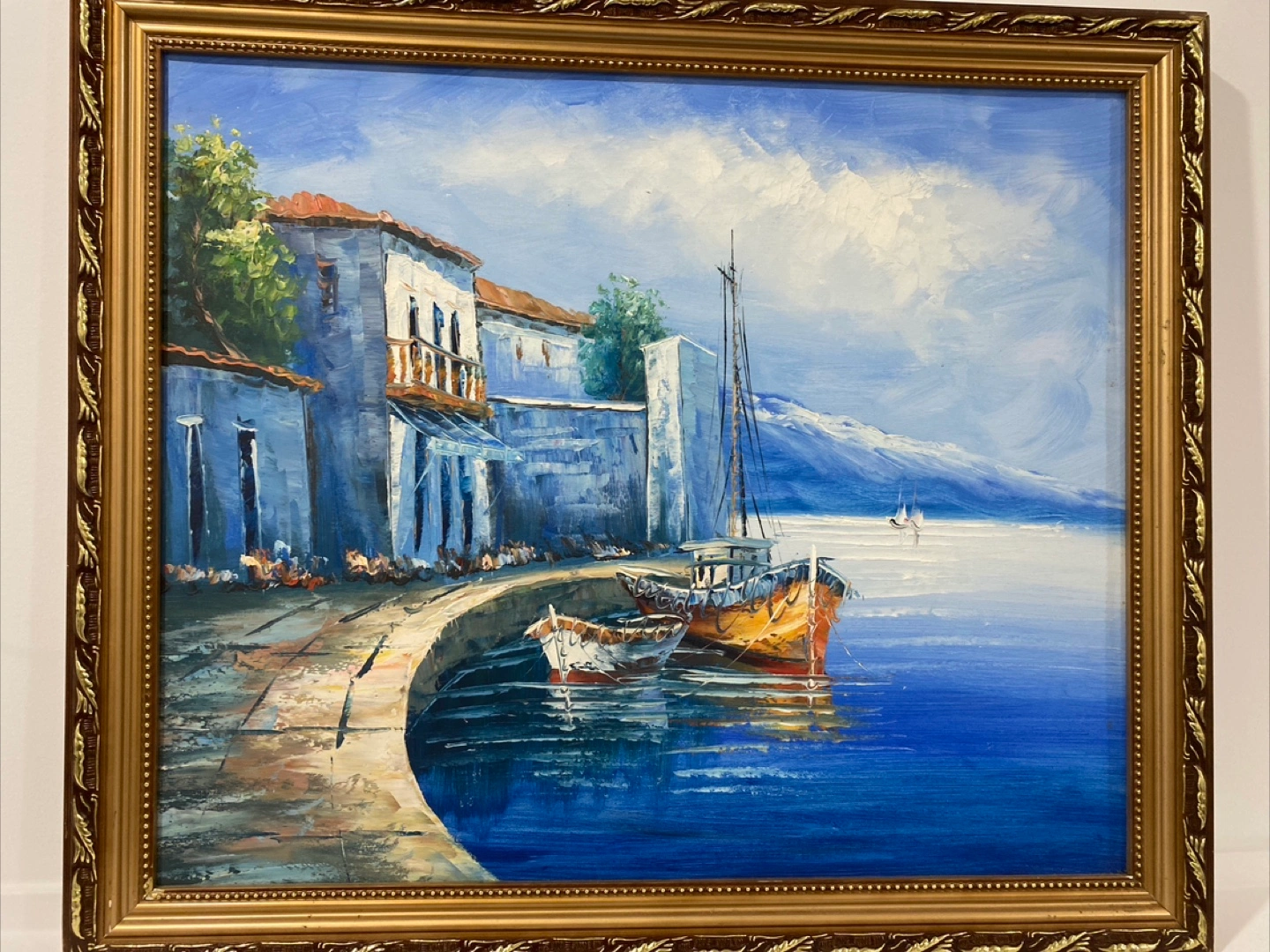 A beautifully framed oil painting. It depicts a seaside harbour scene with boats and buildings. I think it would look great in a living room where you can enjoy the relaxing view. The frame has intricate details.
