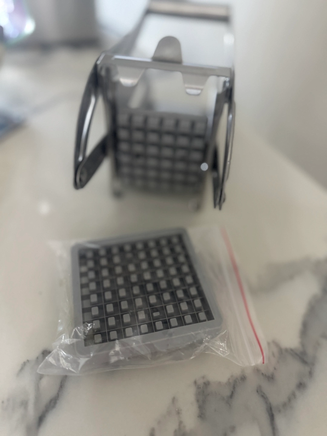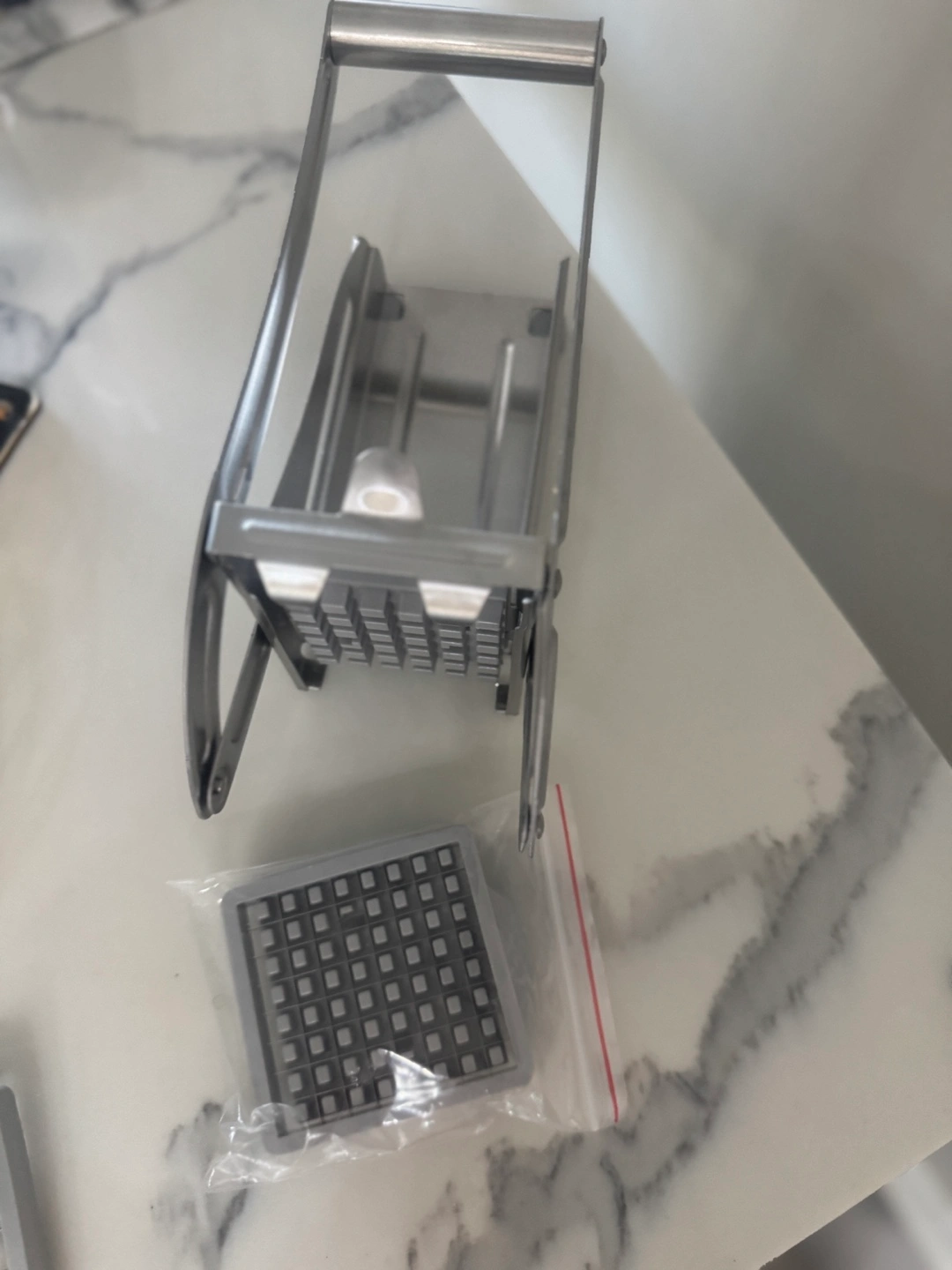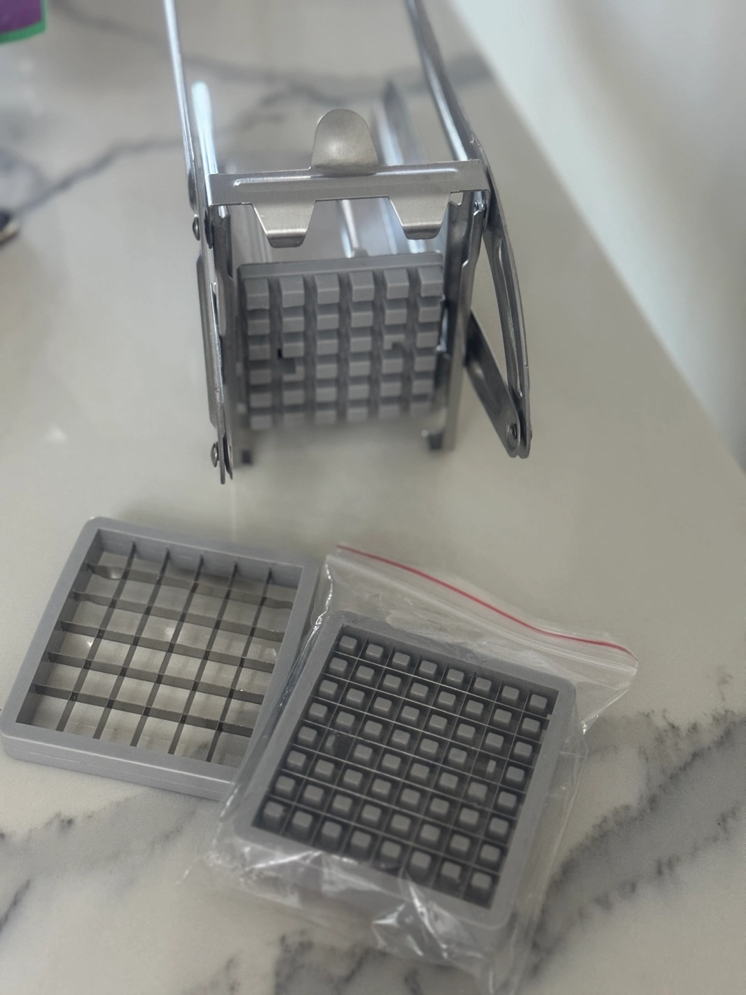 I am selling this French fry cutter. It's in very good condition and comes with two different cutting inserts. Making homemade French fries can be a very rewarding and therapeutic activity. The thinner cutter is brand new. I just tried once the bigger one.