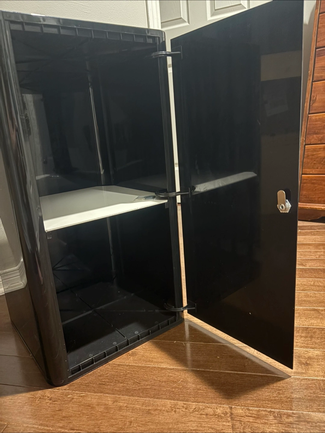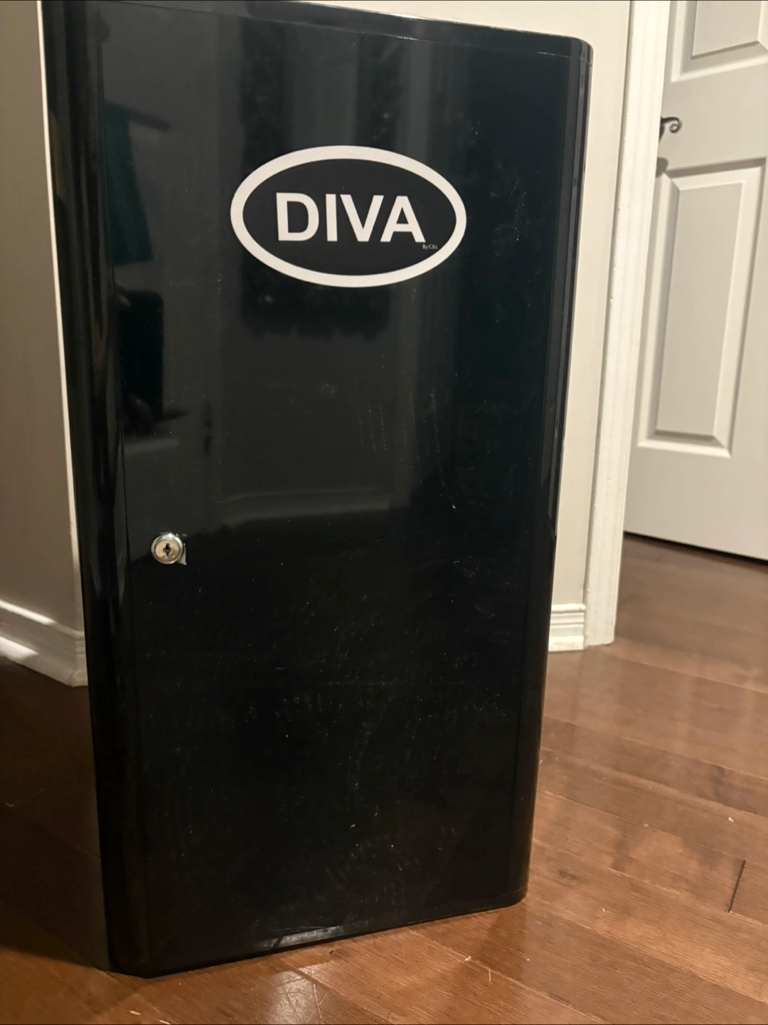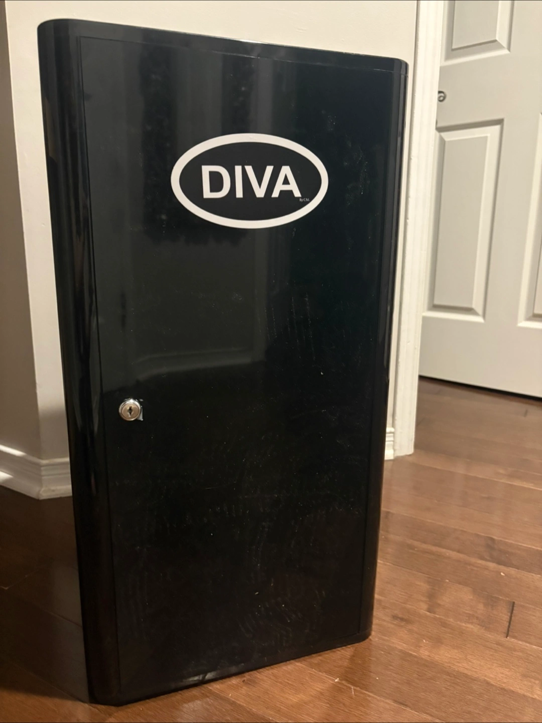 Lockable black cabinet, with the Diva logo. The cabinet has a key lock, including a key in a plastic bag. Inside the cabinet, there is shelving for storage. It's a great item to get to organize your important belongings and find inner peace. 25” tall 13 “ wide