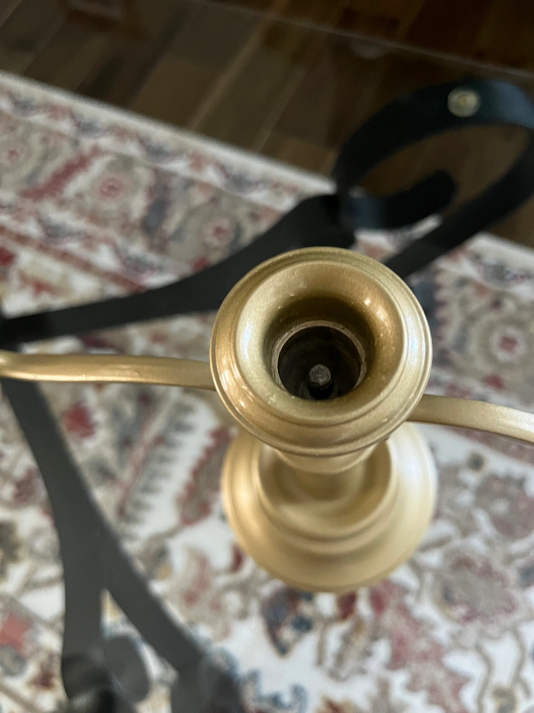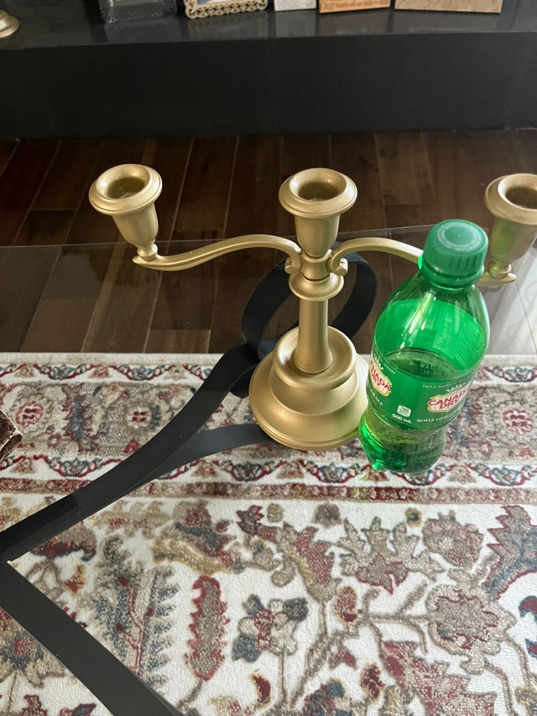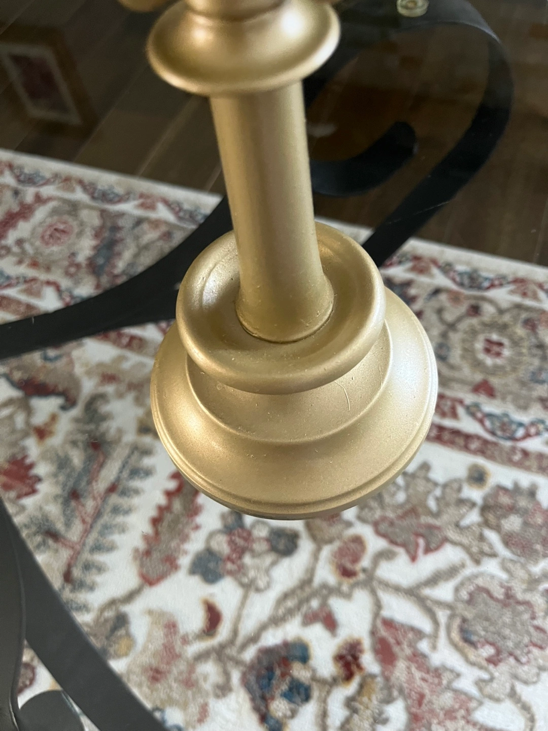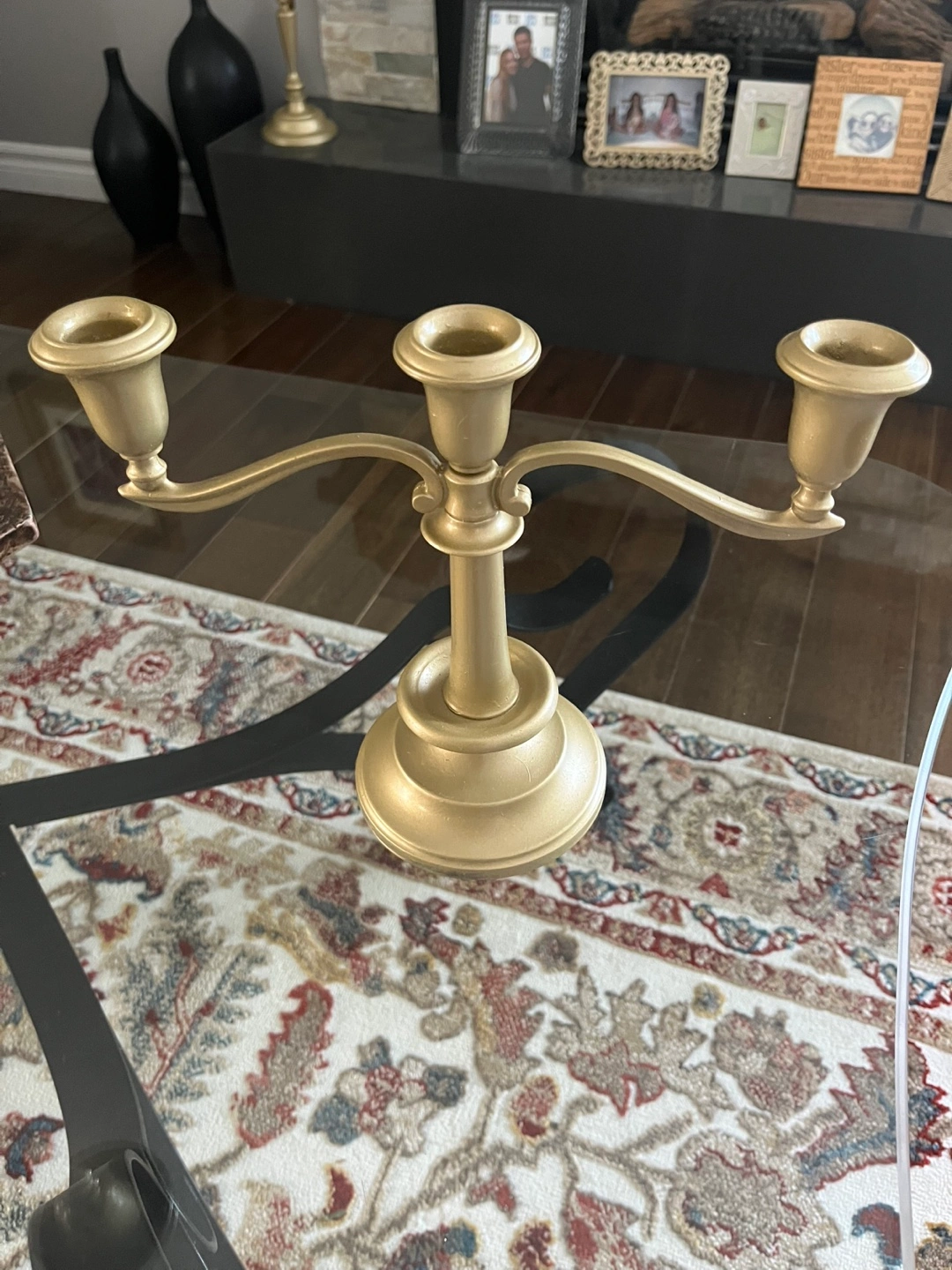 A gold candlestick holder. Features three holders. The base appears round. A great item to bring a calm atmosphere to your home. It was silver, painted in gold.