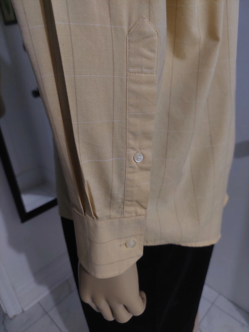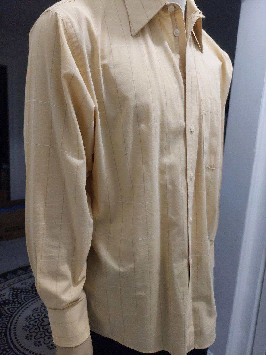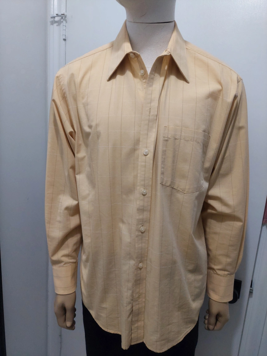 A cotton long-sleeved button-down shirt. Features a chest pocket and a spread collar. The shirt is yellow with a subtle plaid pattern. This shirt is perfect for any occasion. Please browse at my other pieces for a discount on multiple orders. Thank you for your time.
