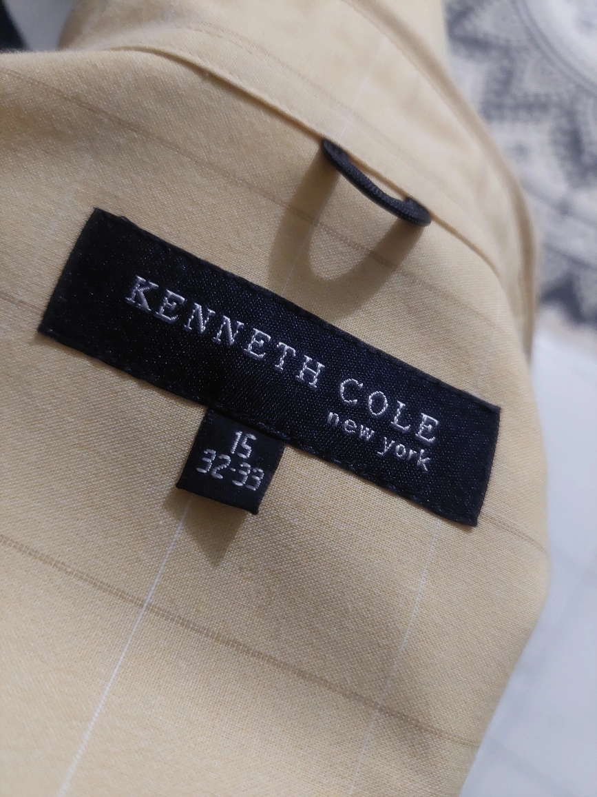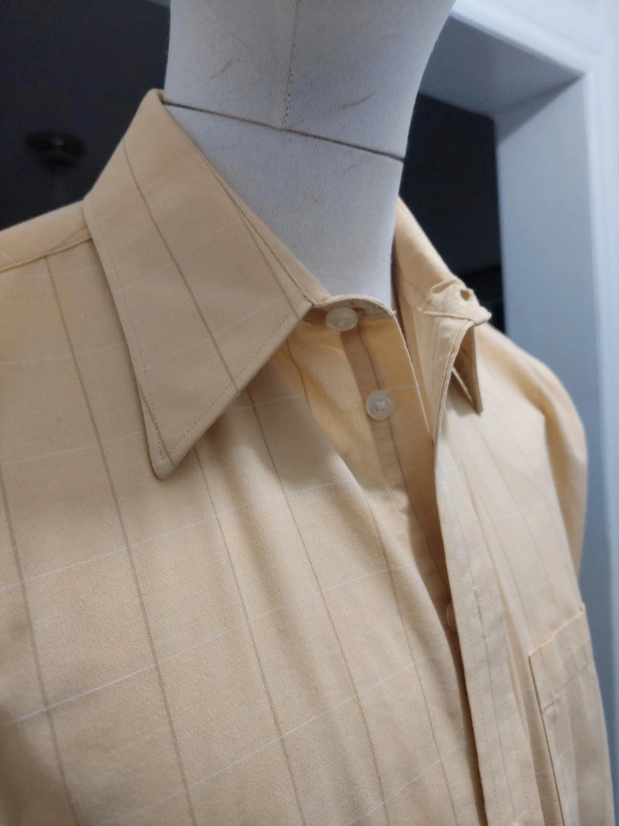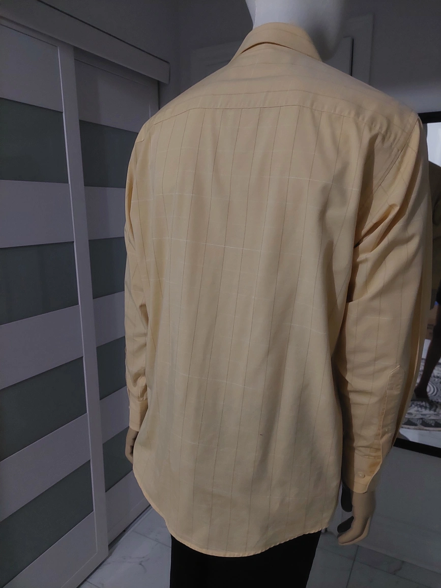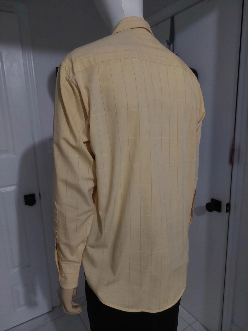 A cotton long-sleeved button-down shirt. Features a chest pocket and a spread collar. The shirt is yellow with a subtle plaid pattern. This shirt is perfect for any occasion. Please browse at my other pieces for a discount on multiple orders. Thank you for your time.