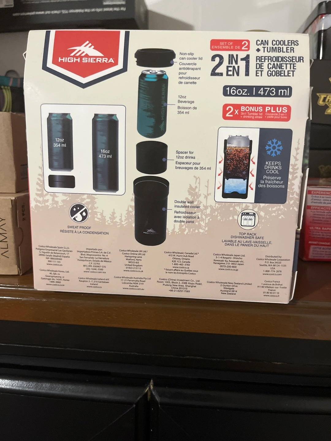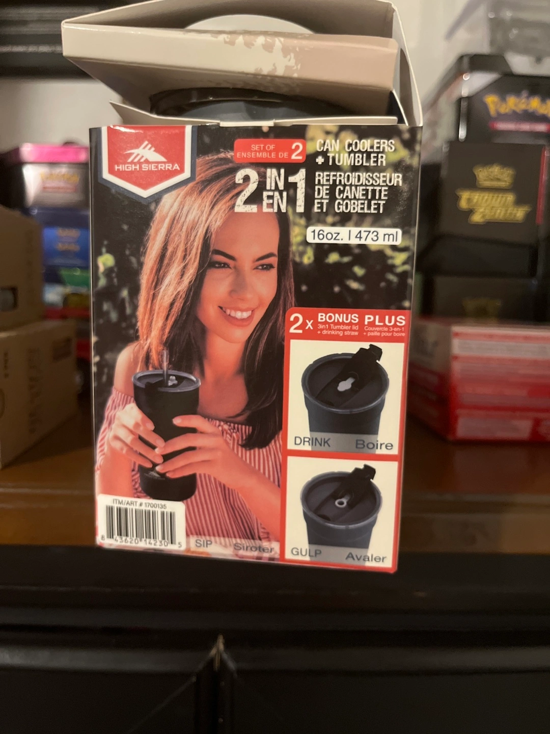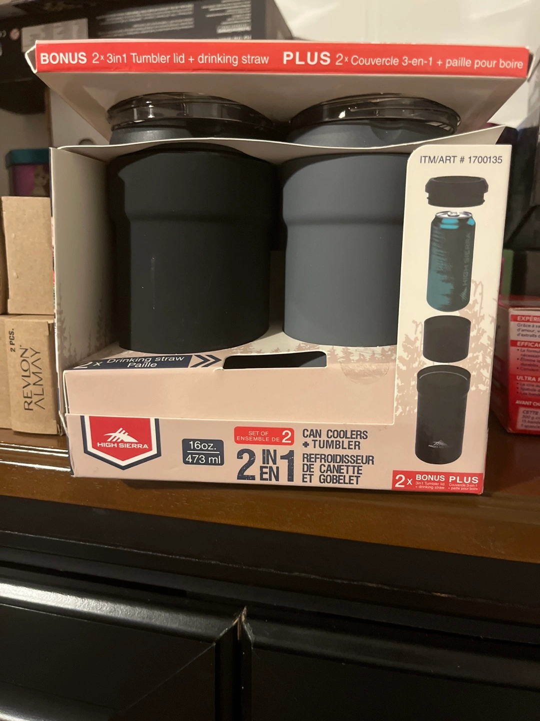 A set of can coolers and tumblers. It's an easy way to enjoy your beverages at the perfect temperature. There are two bonus tumbler lids and drinking straws included.