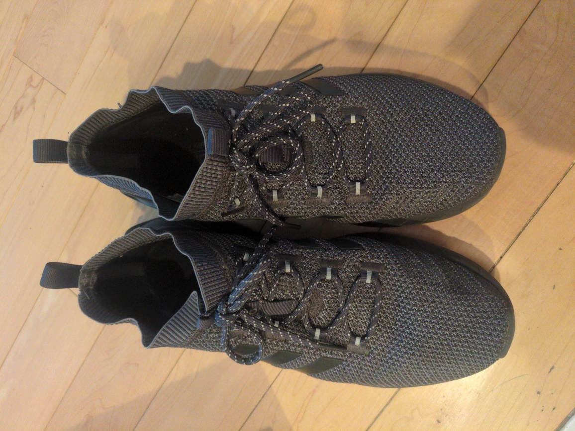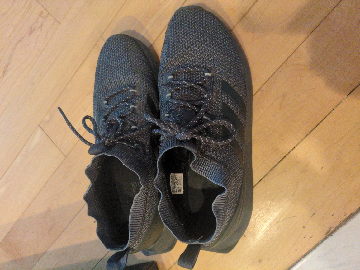 Pair of dark grey Adidas running shoes. Includes the original box. The shoes offer a comfortable fit, perfect for your daily runs.