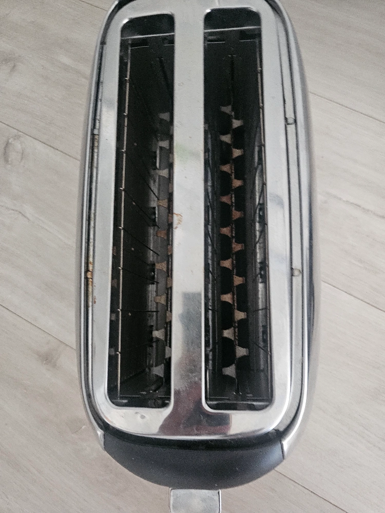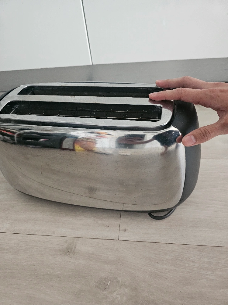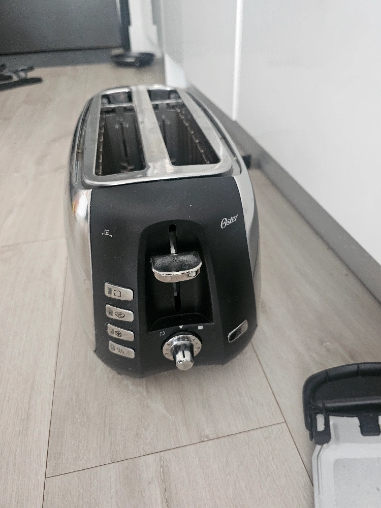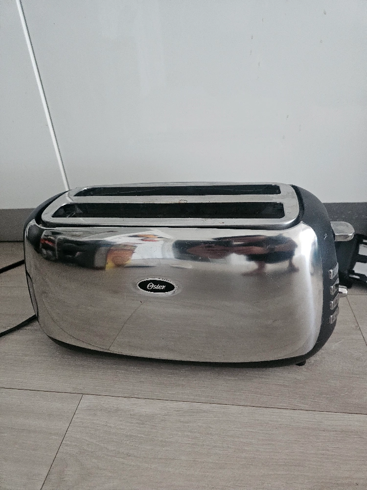 A stylish toaster. Features a shiny, metallic exterior. Black details on the sides and top. A dial and buttons are located on one side, with the Oster brand logo also visible. Enjoy warm toast to bring a little bit of joy to your day. big size toaster I am measuring with A4 paper as shown.