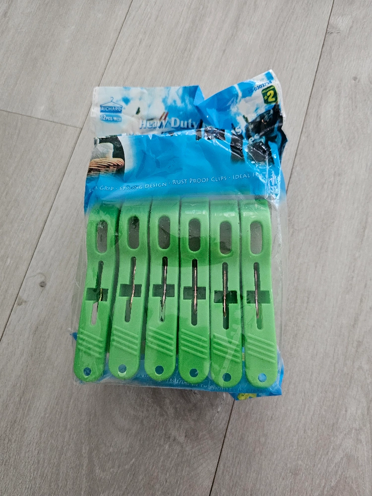 Bright green clothes pegs. Heavy-duty clips with strong grip. Perfect for drying clothes outside, bringing a sense of calm to your day.