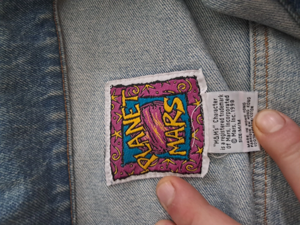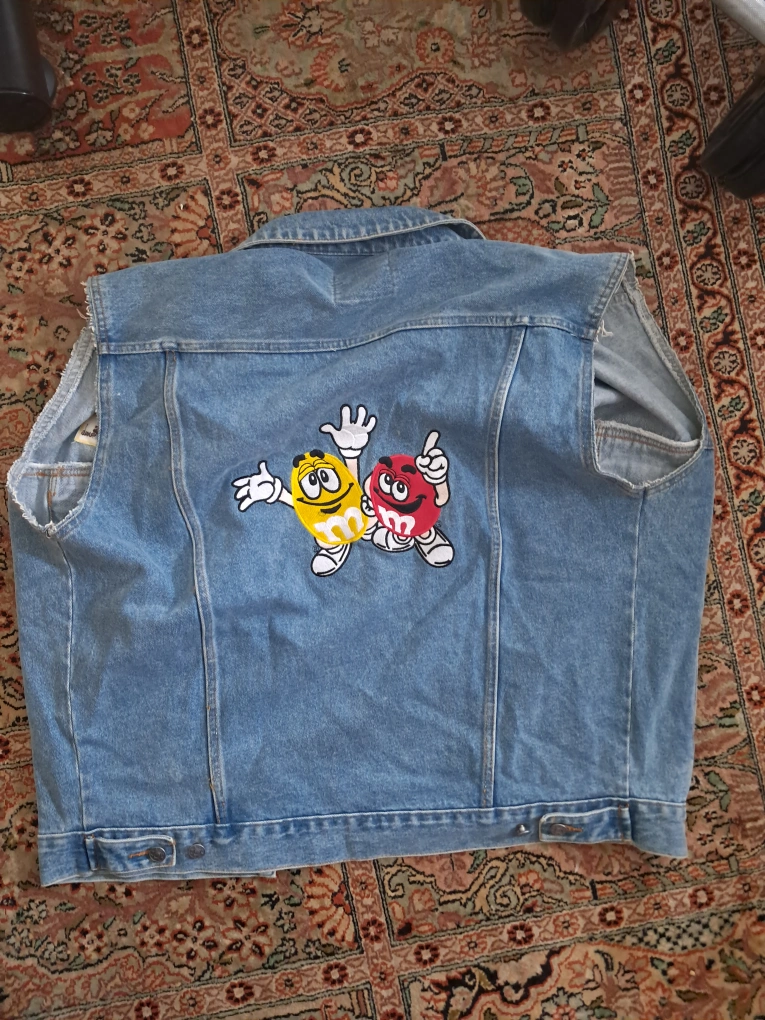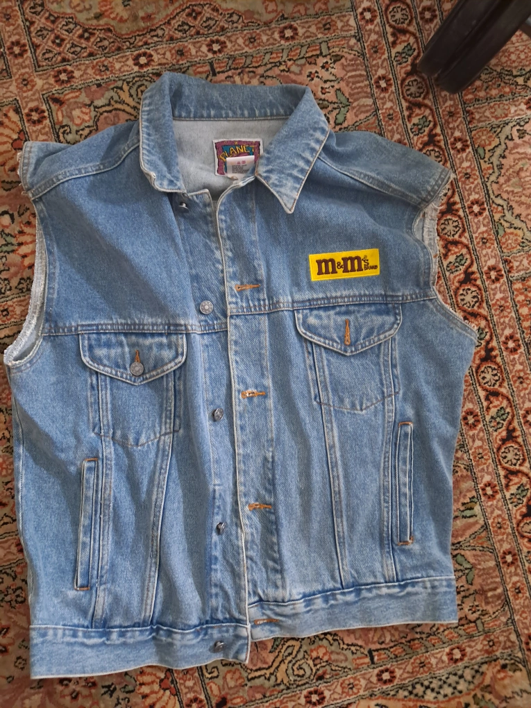 vintage M&Ms jean vest. button up. Great condition considering its age. Officially branded M&M gear! Fairly large for a medium.