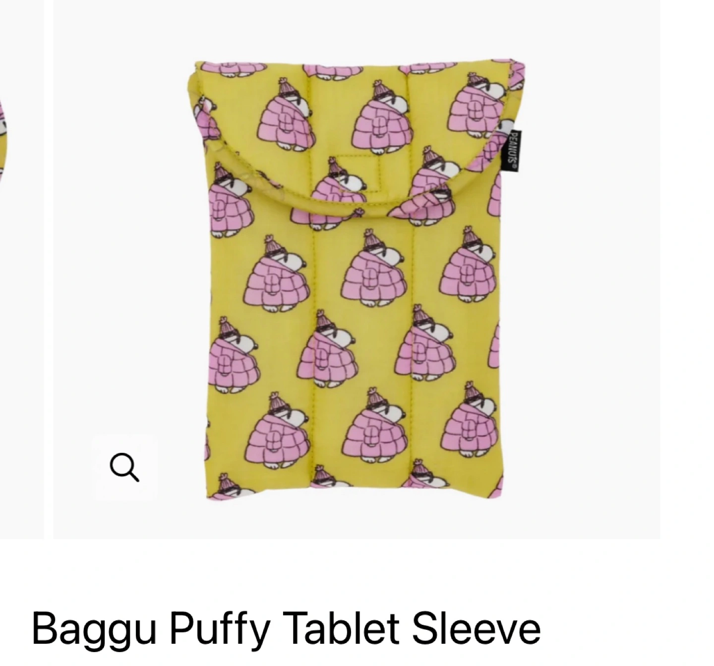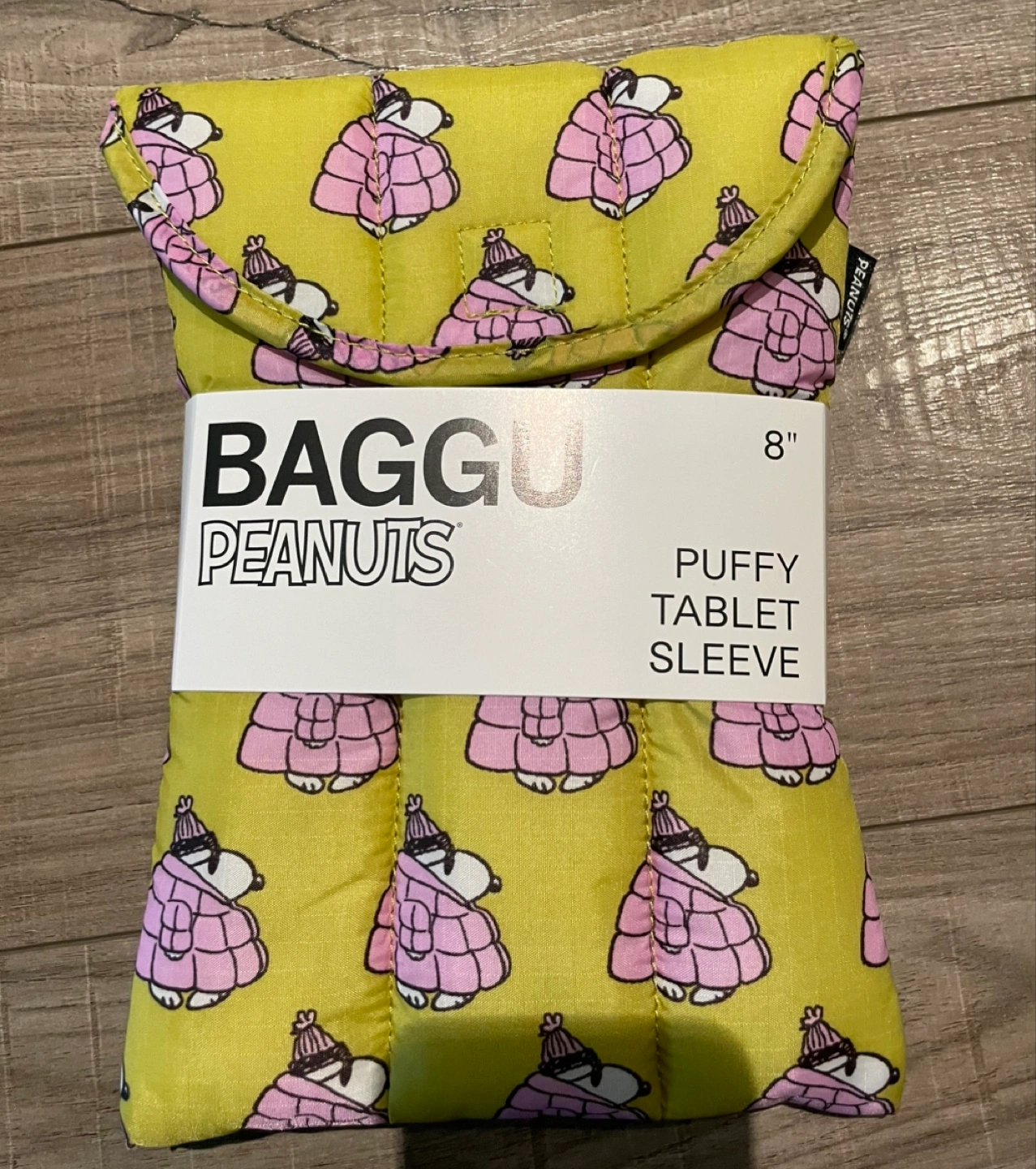 A Baggu puffy tablet sleeve in the style of Peanuts. The sleeve is patterned with Snoopy wearing a coat on a yellow background. The sleeve has a flap closure, and is made of quilted material. It is a great way to keep your tablet safe and sound while you're out and about.