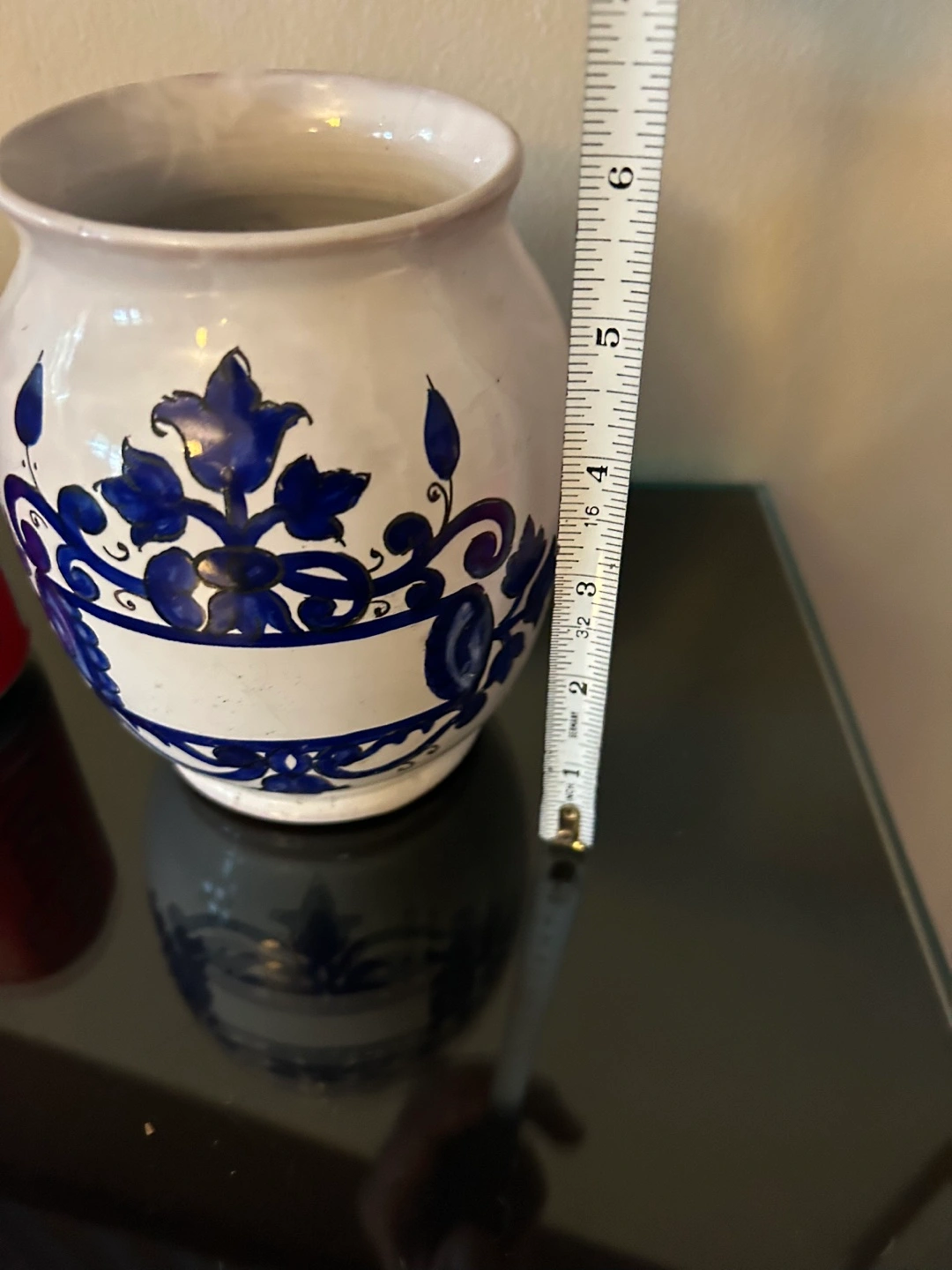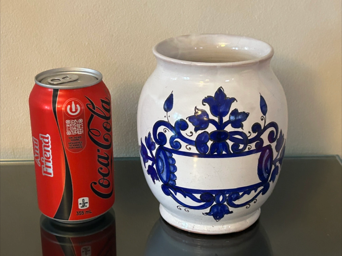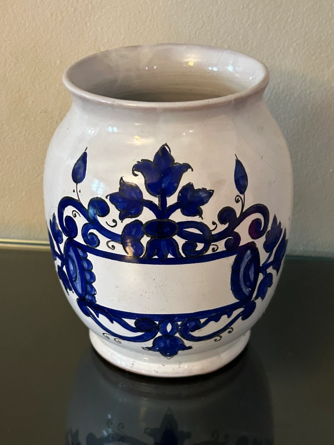 Apothecary jar container 6 inches high pot majolica pottery flower vase blue white vintage antique This was from my great aunt / godmother I've inherited some pottery and other items from her Looks to be an apothecary vase container Nice blue and white decoration Small size 6 inch tall I don't know any info about age or value so just trying to price fairly Would make a nice vase or to hold kitchen utensils She may have had a plant in it No drainage hole though 2.00 Flexible re pickup Elmsdale Road M4J 3M3 Donlands O'Connor East York Don Mills south exit