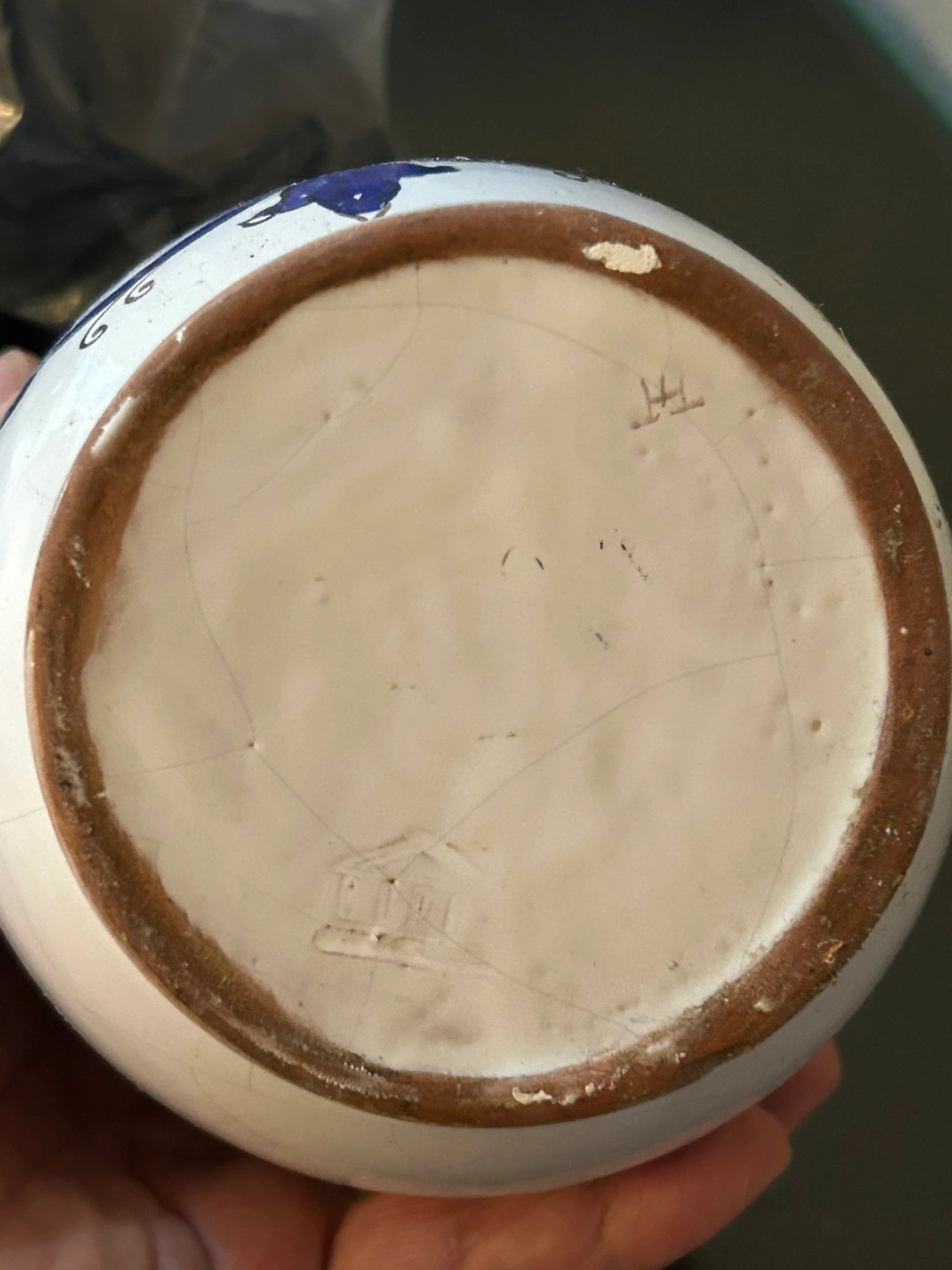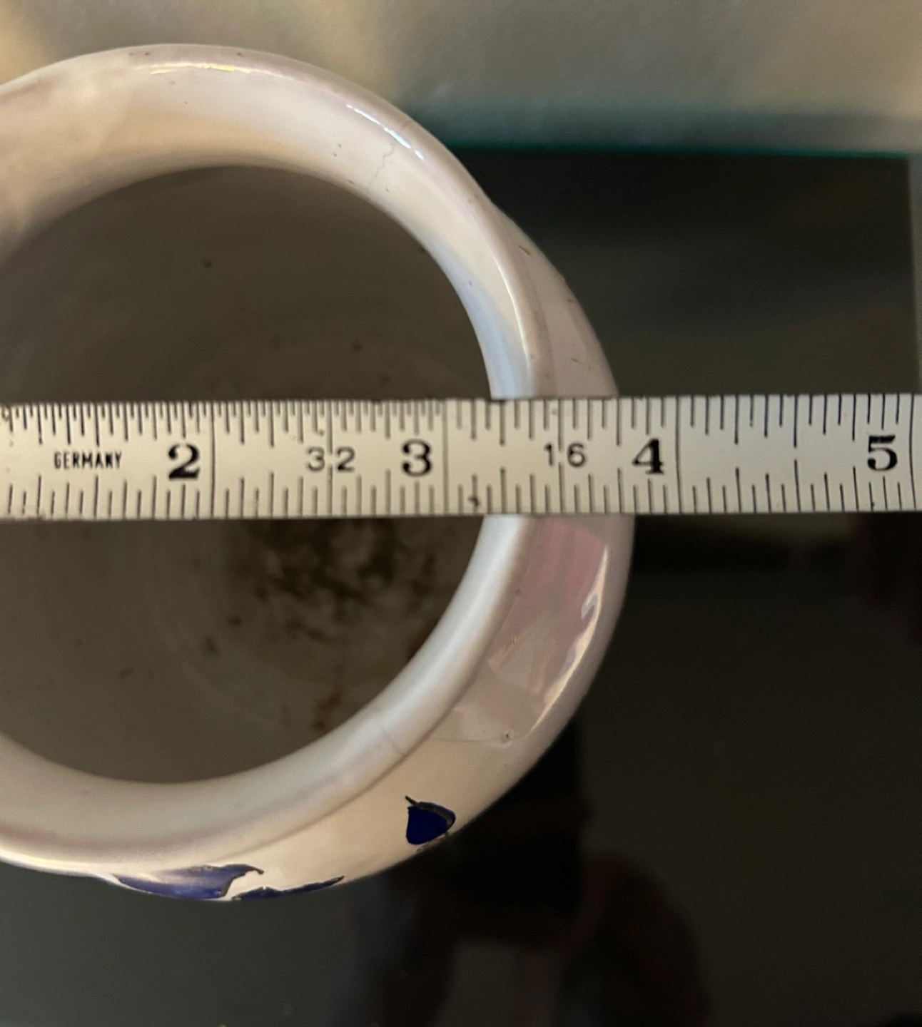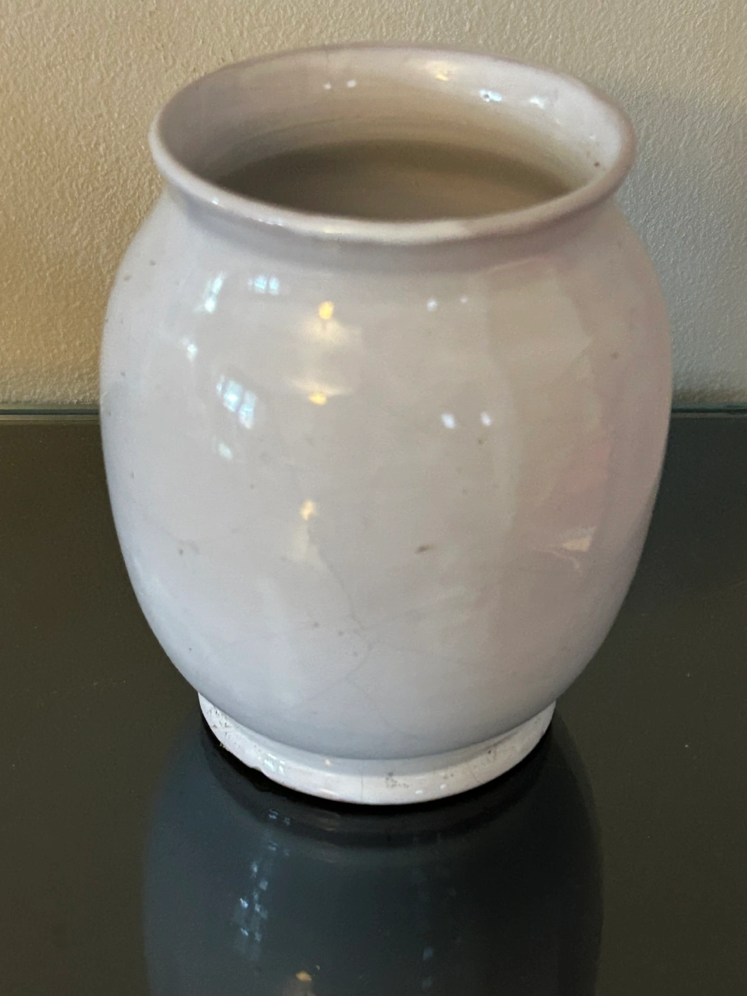 Apothecary jar container 6 inches high pot majolica pottery flower vase blue white vintage antique This was from my great aunt / godmother I've inherited some pottery and other items from her Looks to be an apothecary vase container Nice blue and white decoration Small size 6 inch tall I don't know any info about age or value so just trying to price fairly Would make a nice vase or to hold kitchen utensils She may have had a plant in it No drainage hole though 2.00 Flexible re pickup Elmsdale Road M4J 3M3 Donlands O'Connor East York Don Mills south exit