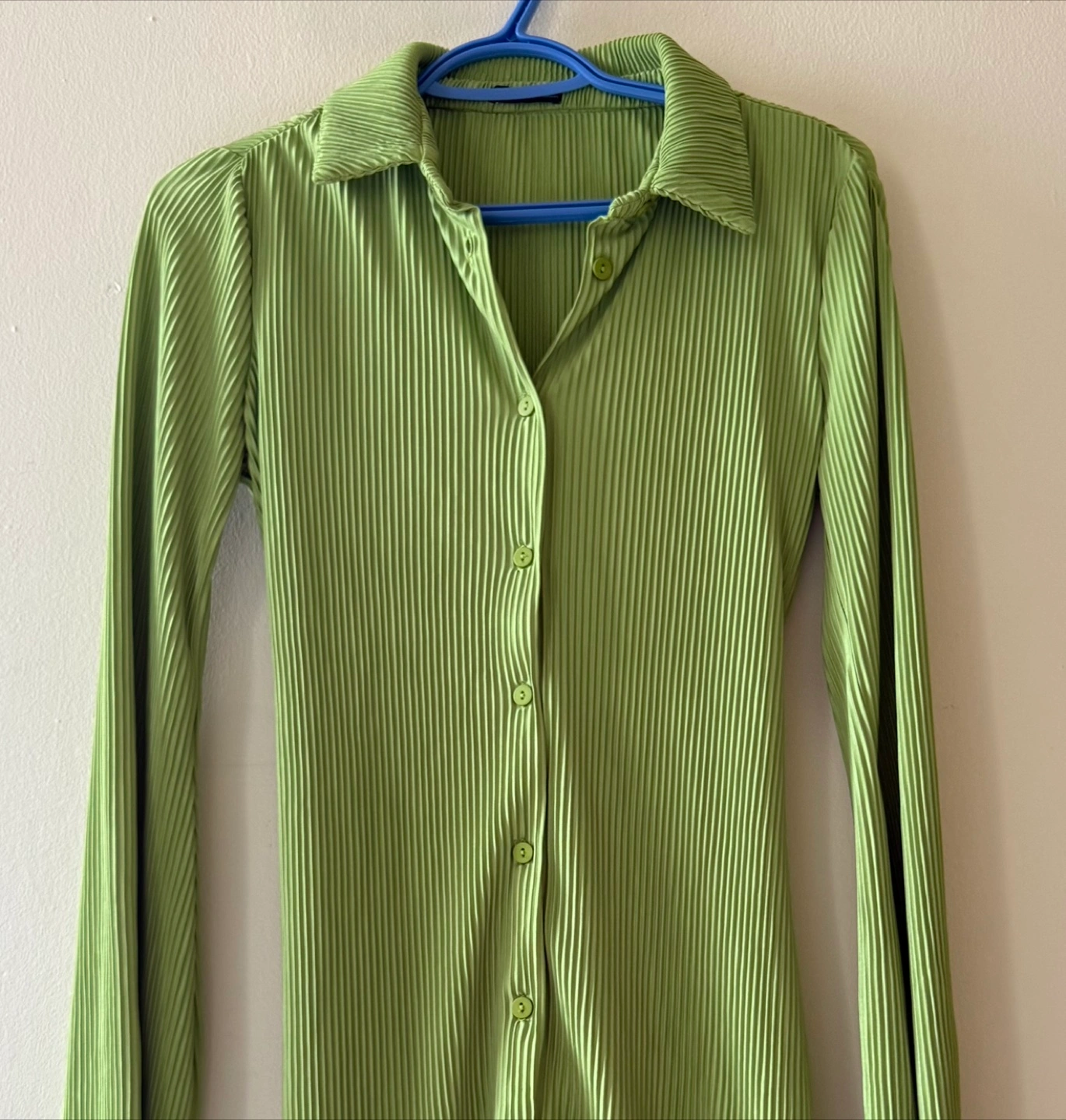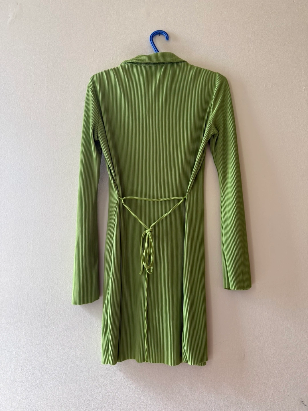 The dress is a vibrant shade of lime green. Features a collared neckline and button-up front. It has long sleeves and a waist tie. You could wear this while you take a relaxing walk in the park.