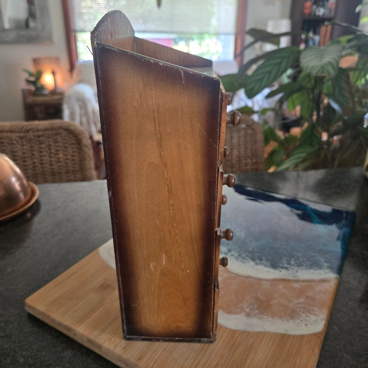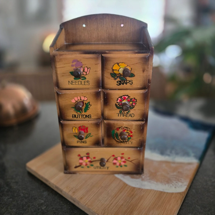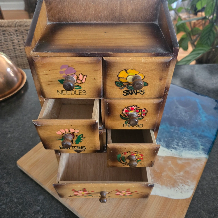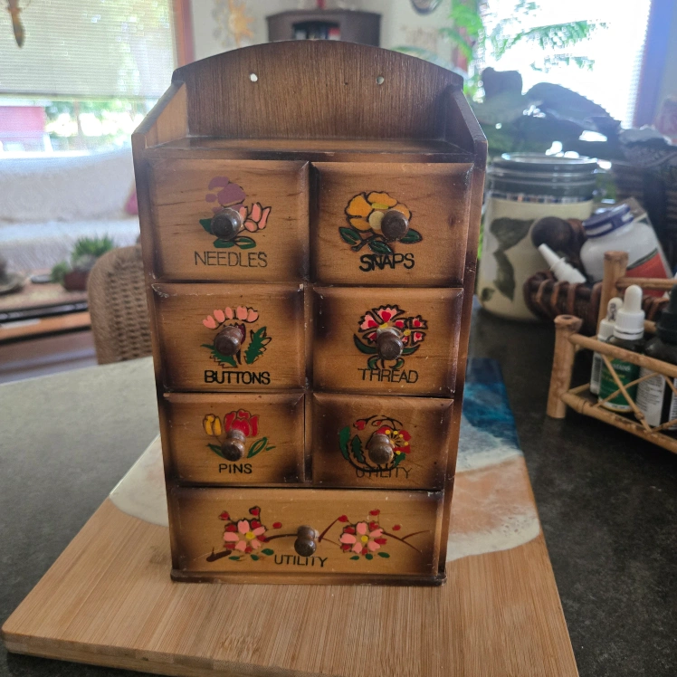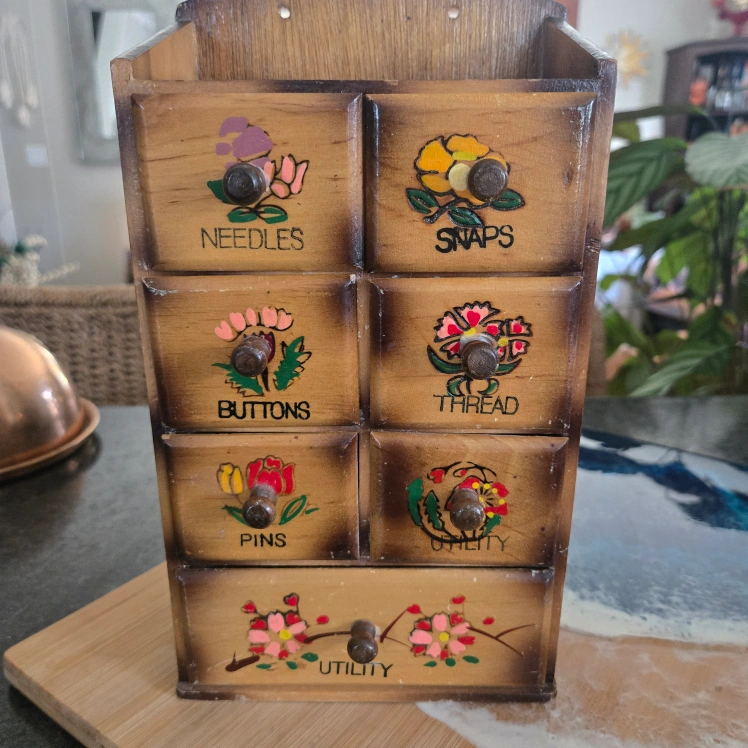 Vintage hand painted 7 drawer cabinet for sewing notions. Two holes at top for hanging or can stand alone. Approx 10” X 6” X 3 1/2”. Some surface wear, but minimal for its age. Features labels such as needles, snaps, buttons, thread, pins, and utility. Drawers have decorative flower motifs. An ideal addition to any sewing room to keep your sewing supplies organized.