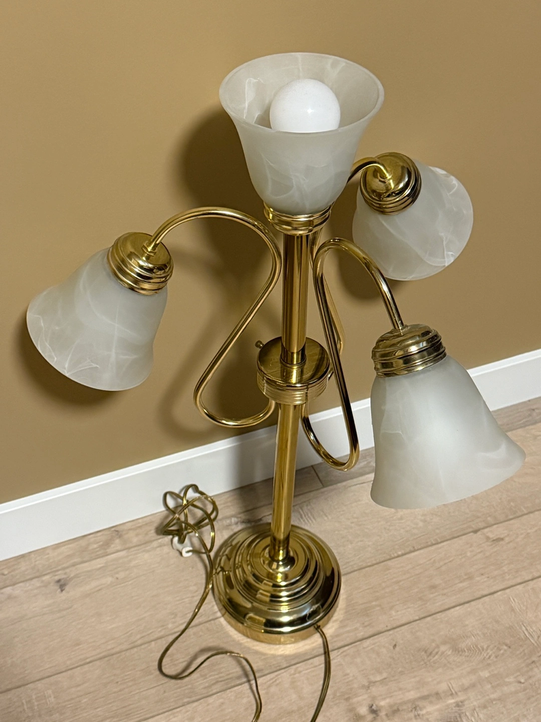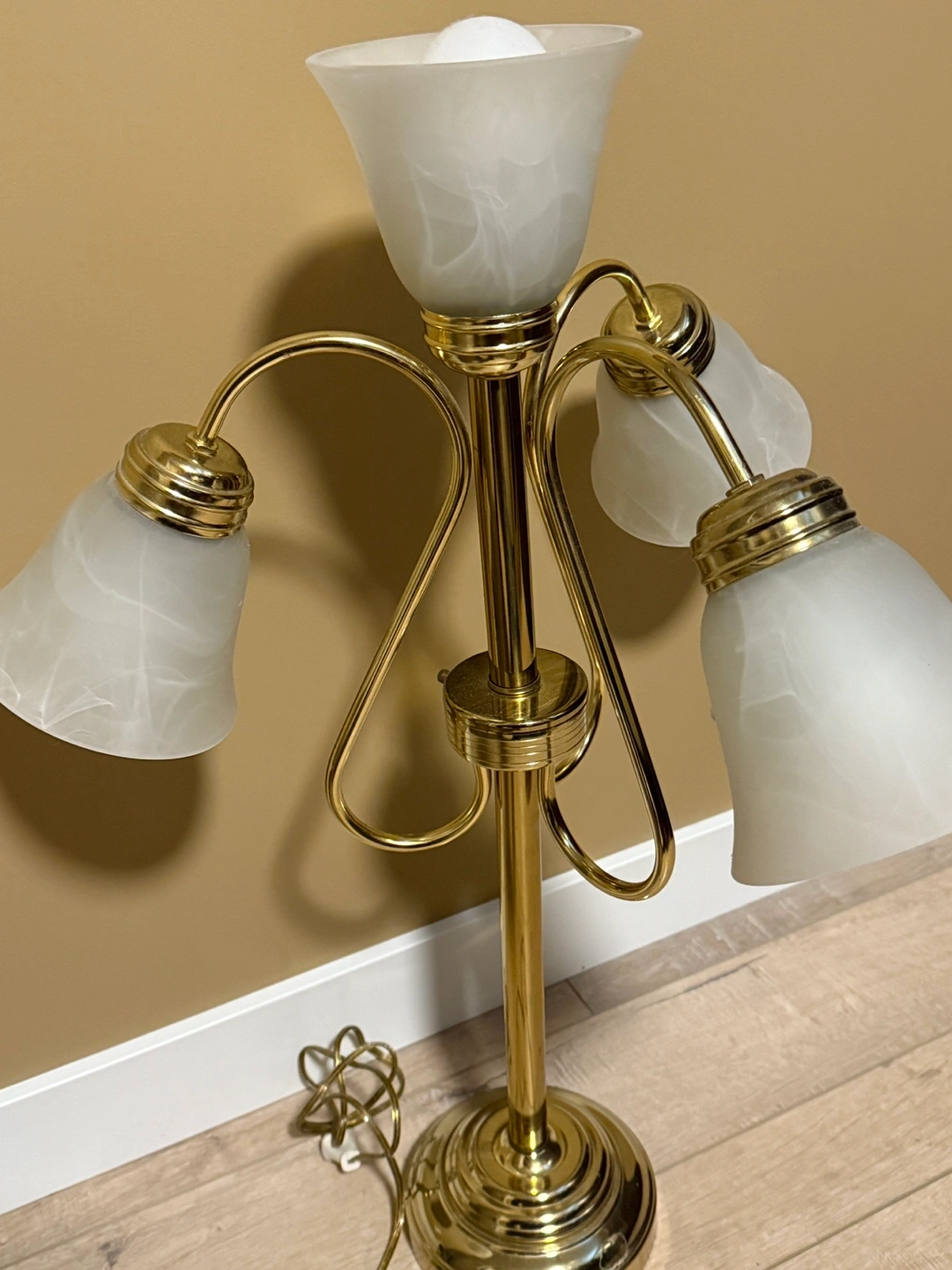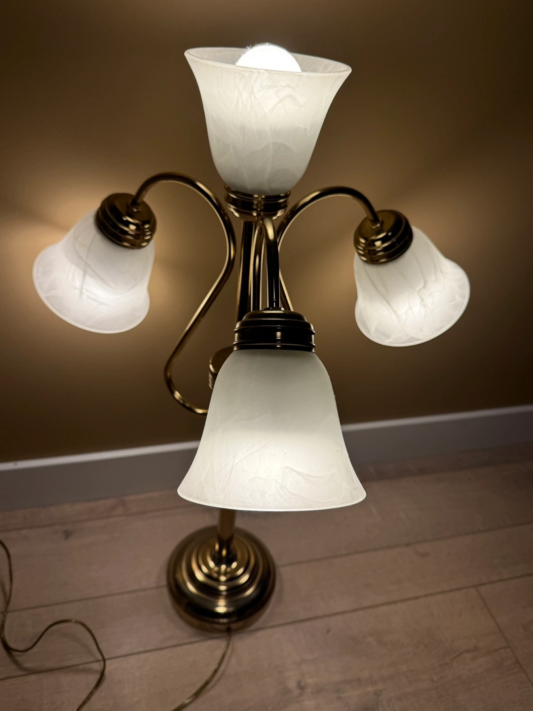 Elegant lamp with a gold finish. Features four shades made of frosted glass. Great for a cozy atmosphere.
