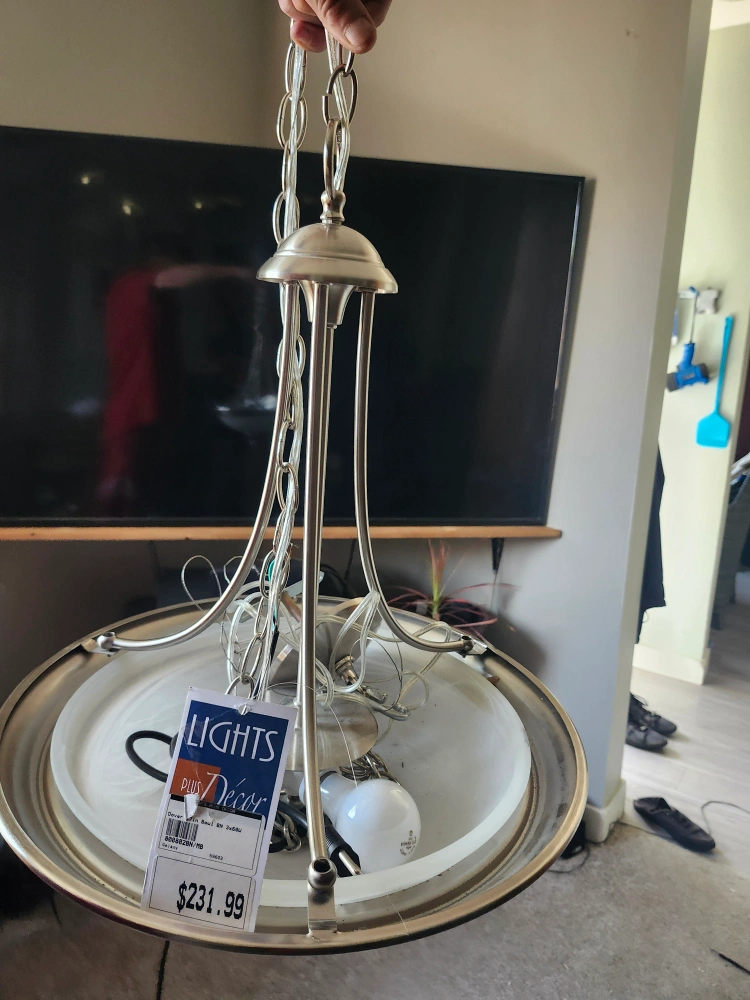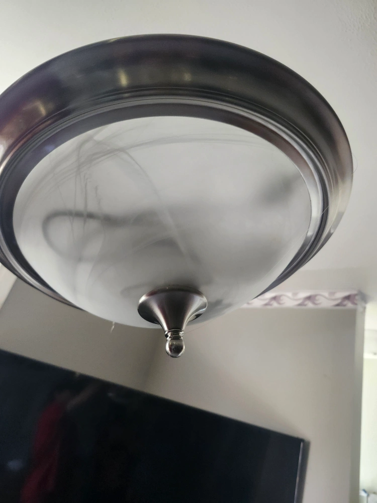 A lovely ceiling light fixture. Has a frosted glass shade. The metal finish is a nice silver tone. It hangs from a chain. It would make a great addition to any room, creating a peaceful atmosphere.