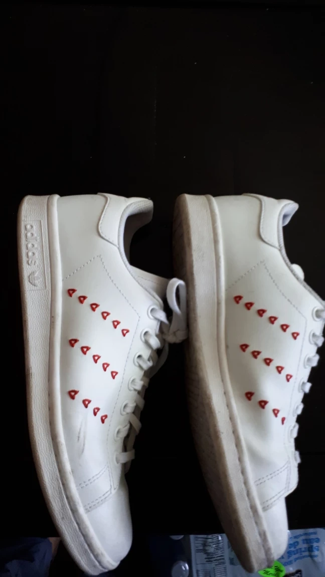 White sneakers with red heart detailing on the side. Features white laces. Great footwear for any activity.