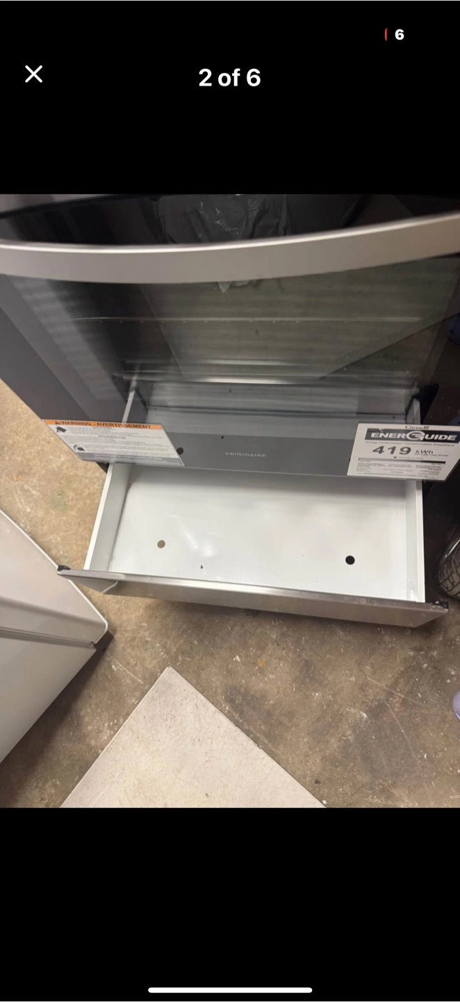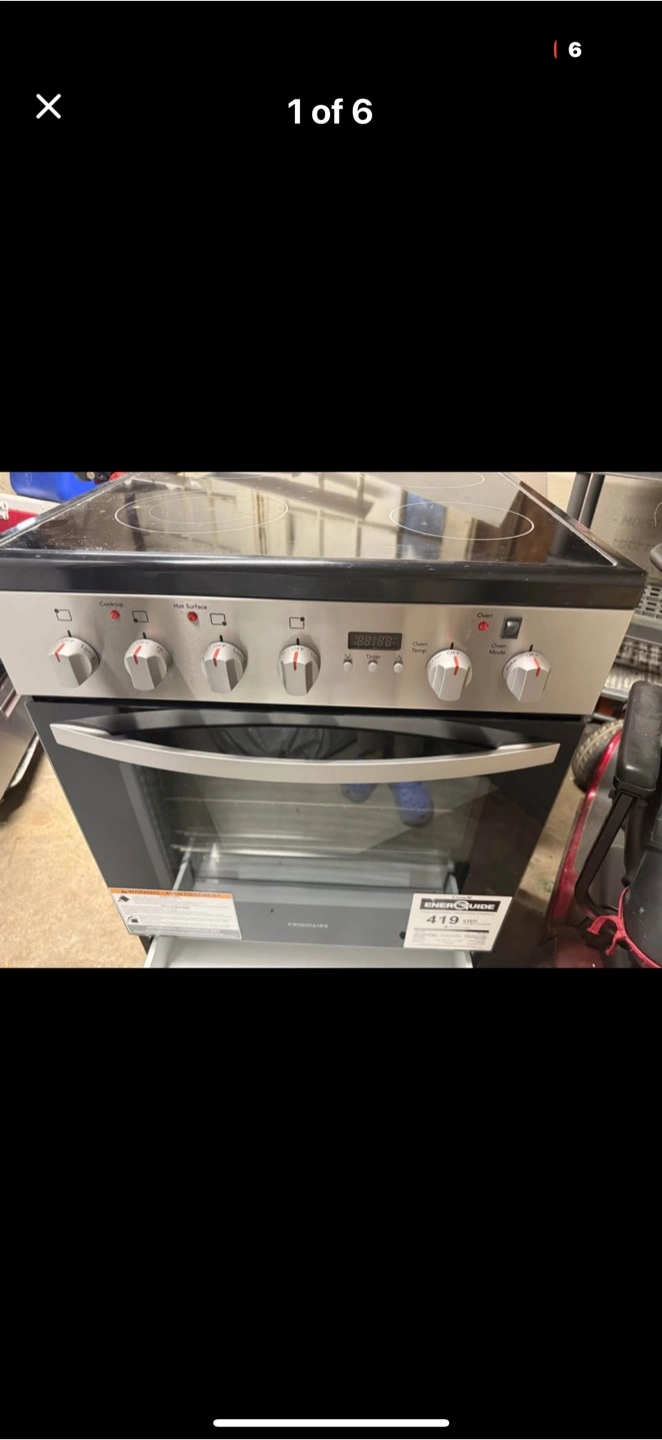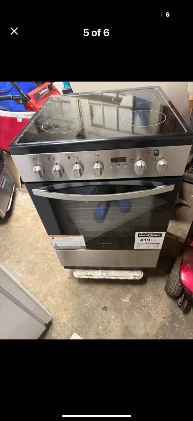 Silver and black electric range. Smooth top with four burners. Knobs for temperature control. Oven door with a glass window. Includes a storage drawer, perfect for keeping all your favorite cookware neatly organized.