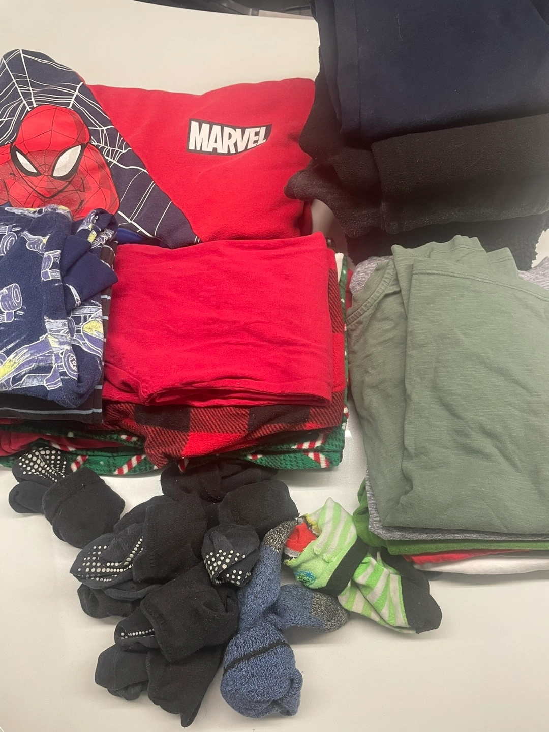 A large collection of boy’s clothes in various colours. The bundle includes t-shirts, long-sleeved shirts, sweatpants, pyjamas and socks (grip socks and thermal socks)