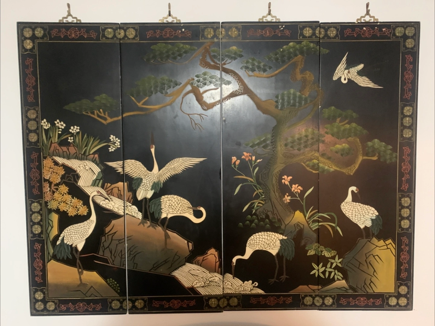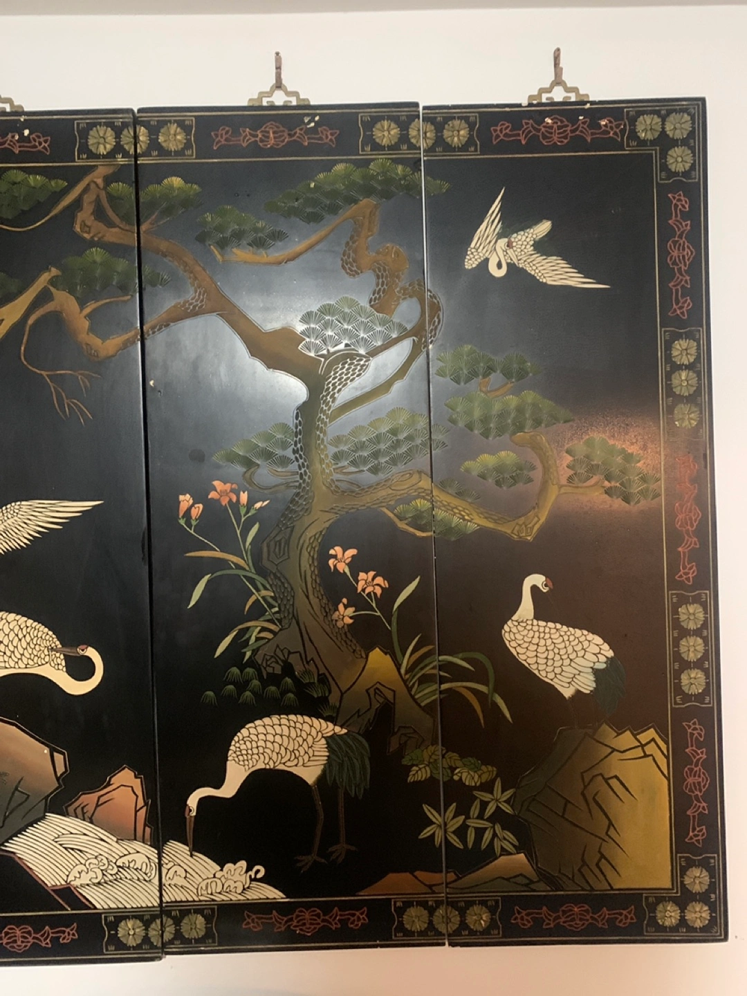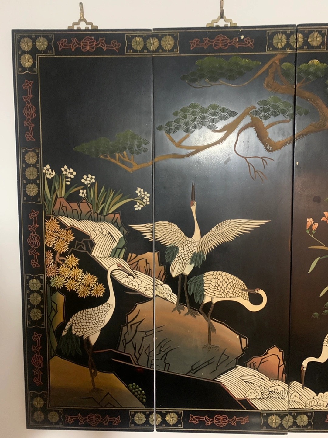 A beautiful decorative wall art. Featuring a detailed crane design with a black background. The screen has intricate details and vibrant colours, perfect for adding a touch of elegance to any space. This wall art is very relaxing and a lovely thing to look at.