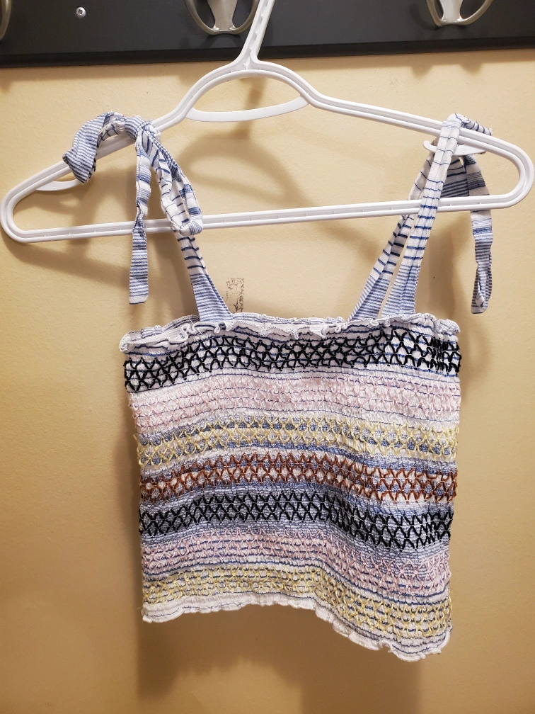 Soft, multi-colored top. Features tie-up straps and a smocked bodice. Perfect for those warm summer days. You could spend a relaxing day at the beach wearing this.