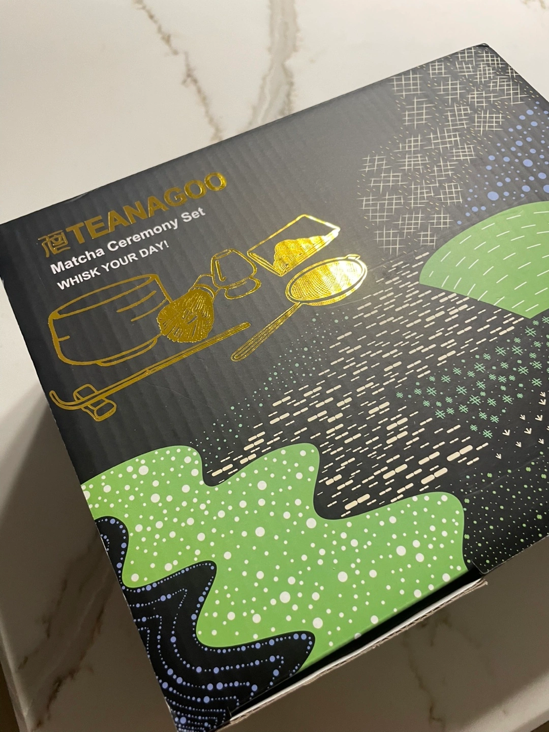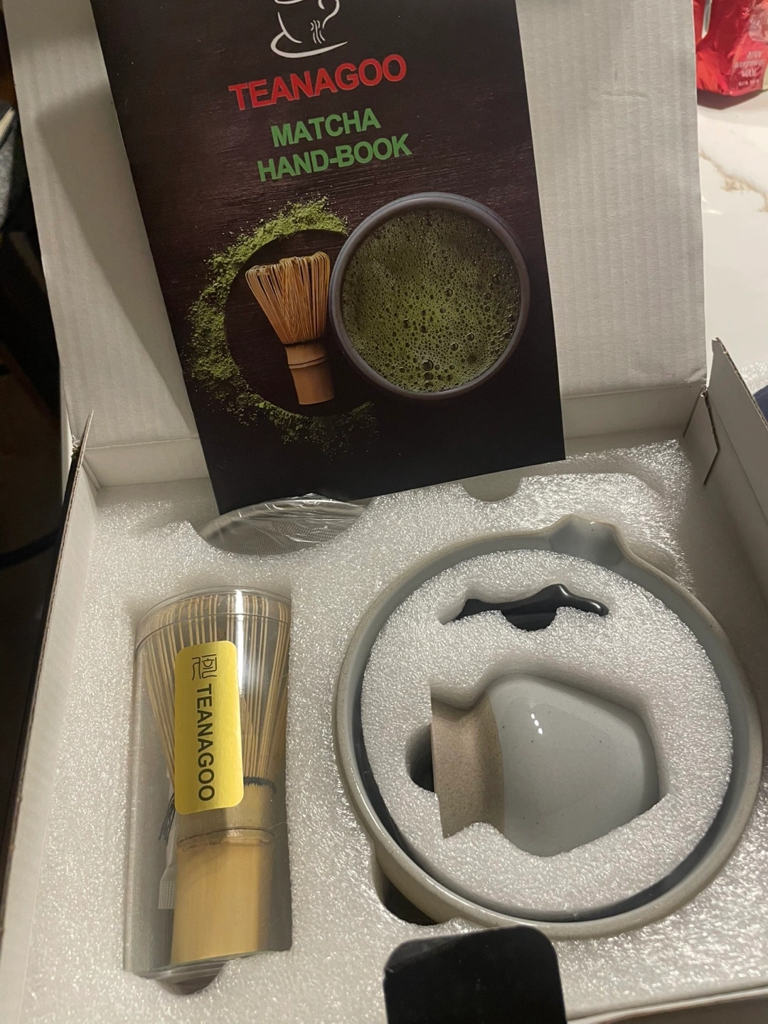 A matcha ceremony set, including a whisk, a bowl, and a hand-book. Perfect for making a relaxing cup of matcha tea. It also comes with a whisk holder and a sifter.