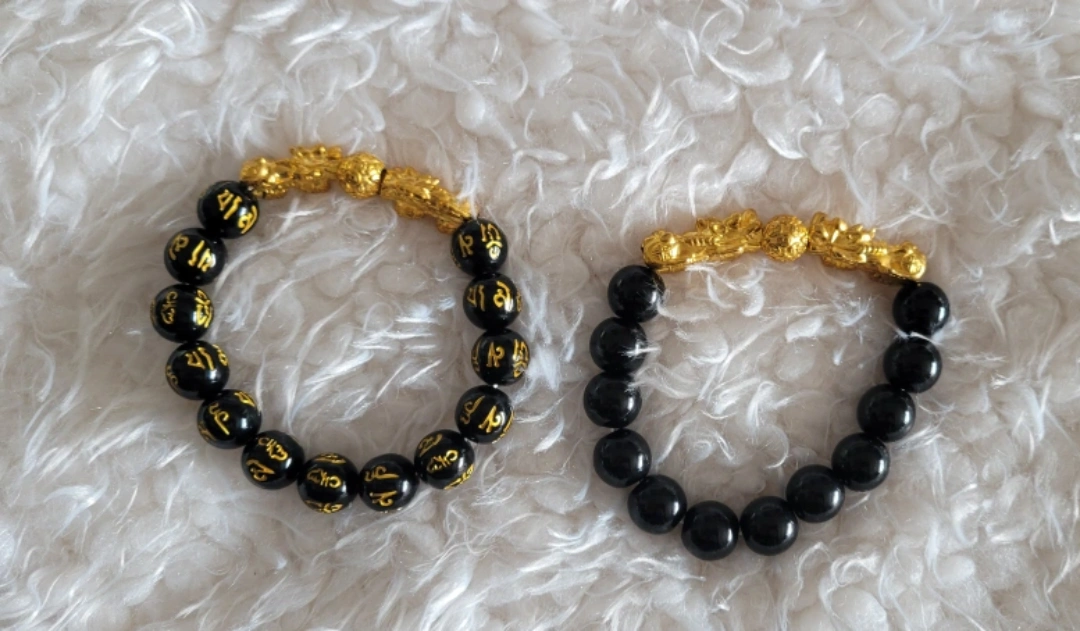 Set of two Feng Shui stretchable Bracelet, Gold tone Pixiu Bracelet Dragon Protection for Men Women, Mantra Prayer Beads Bracelets Meaning to Attract Wealth and Good Luck. 16cm. Check out my other listings! Bundle to save. ππ»πΈ Cash and pickup only on Brimley and Eglinton Rd E. in Scarborough.