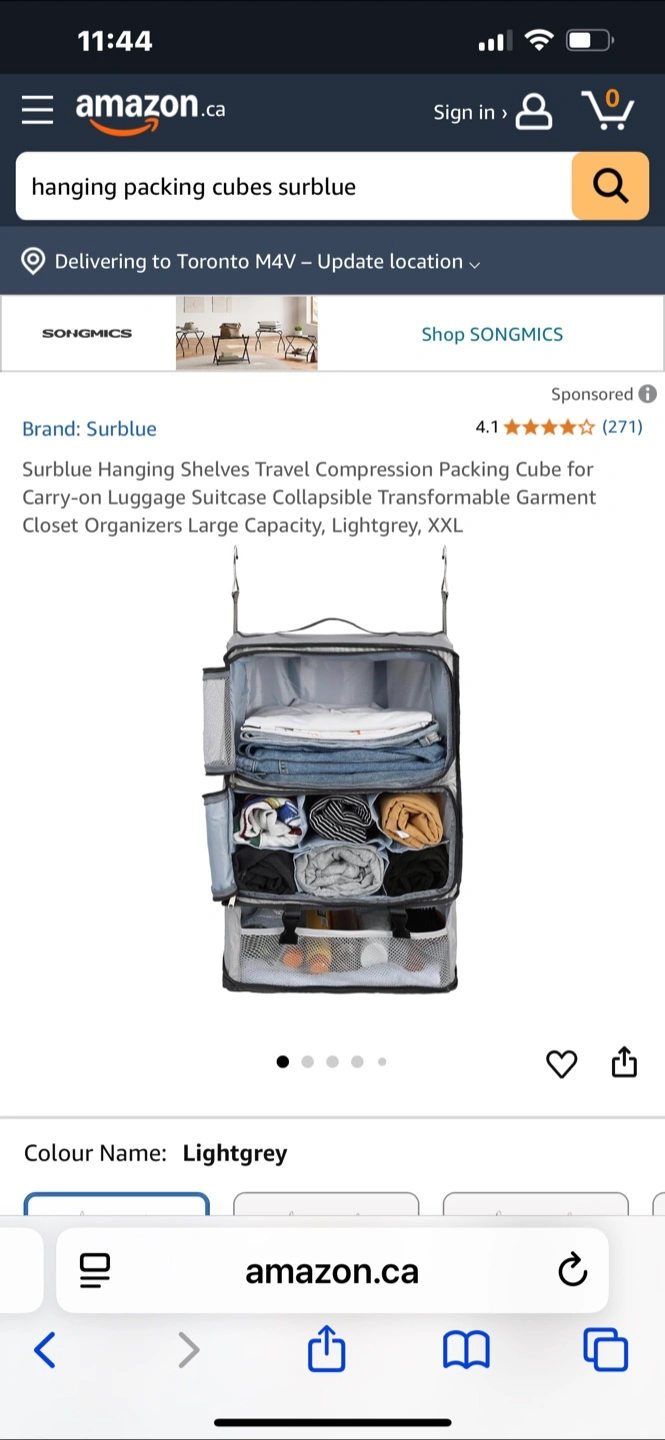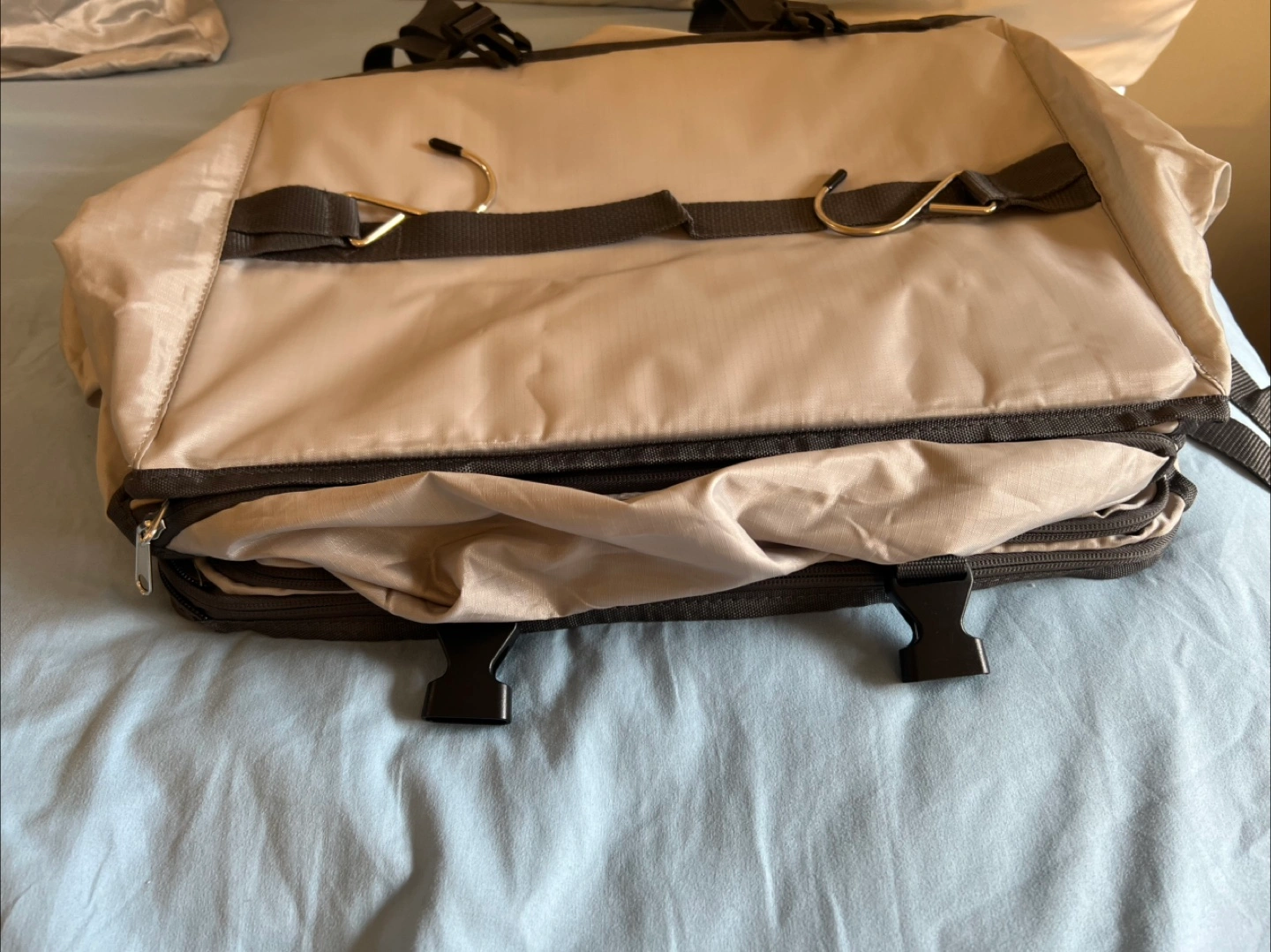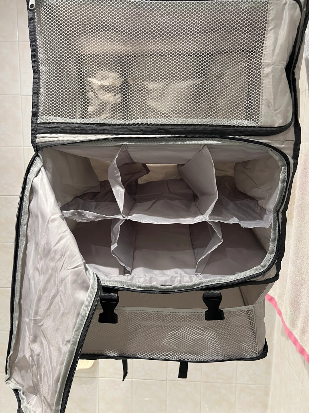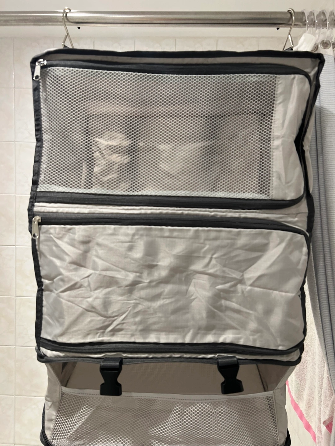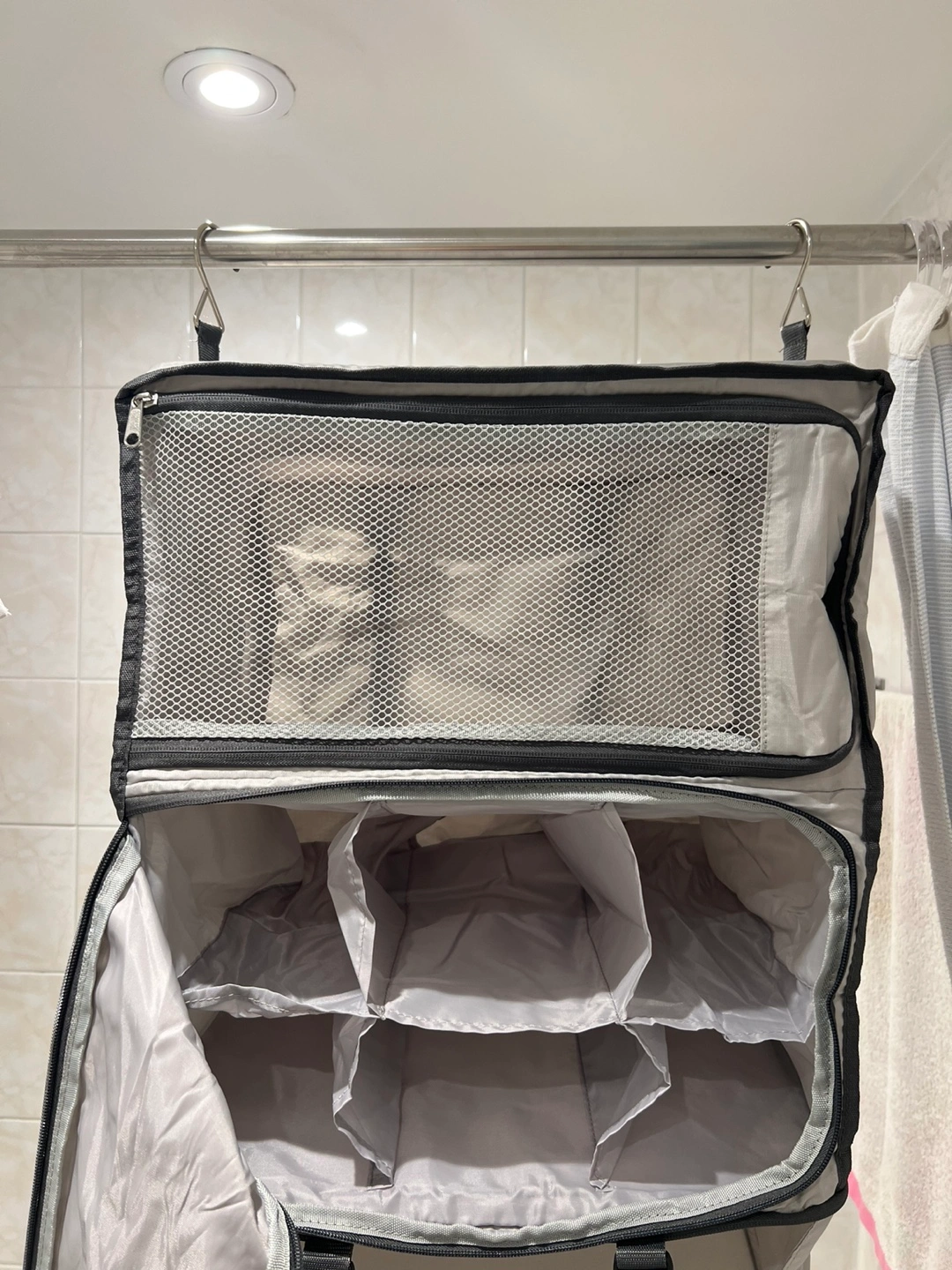 A light grey hanging travel organizer. Features multiple compartments. Zippers on the top. You can hang this in a closet or even on a hook to keep your belongings organized and safe. Great for travel, also at a cottage or dorm. Pick up Yonge & St Clair Cash required