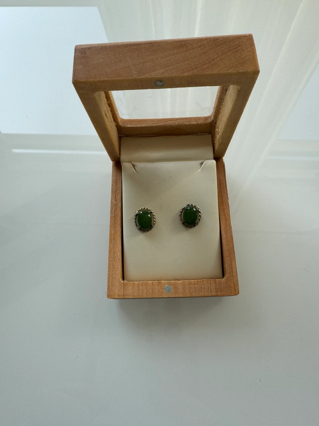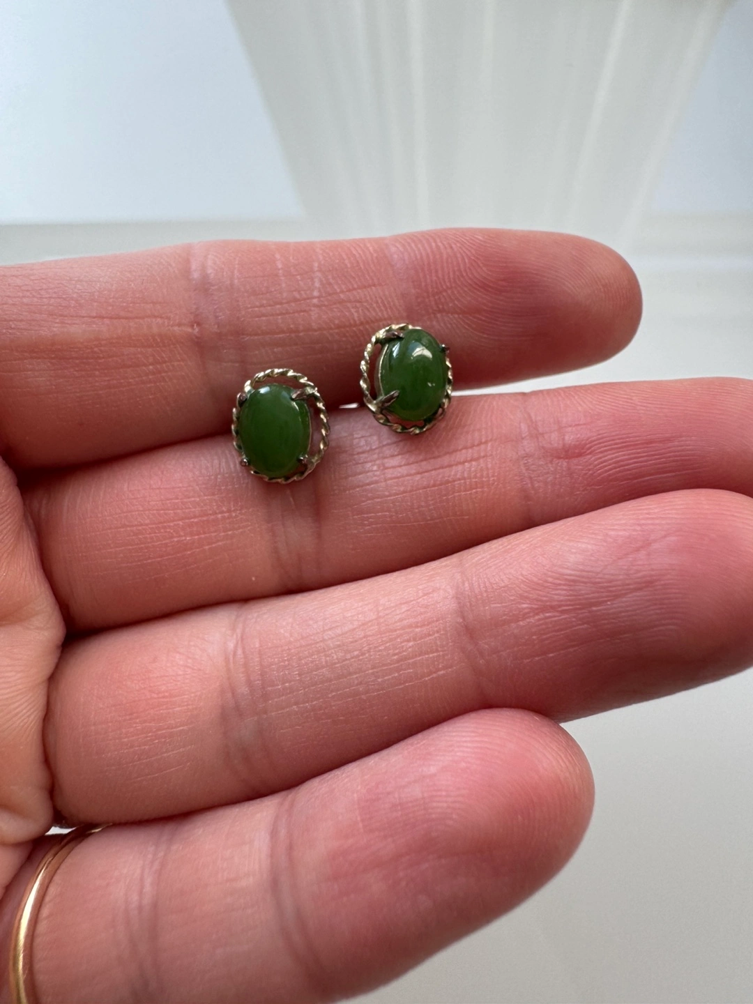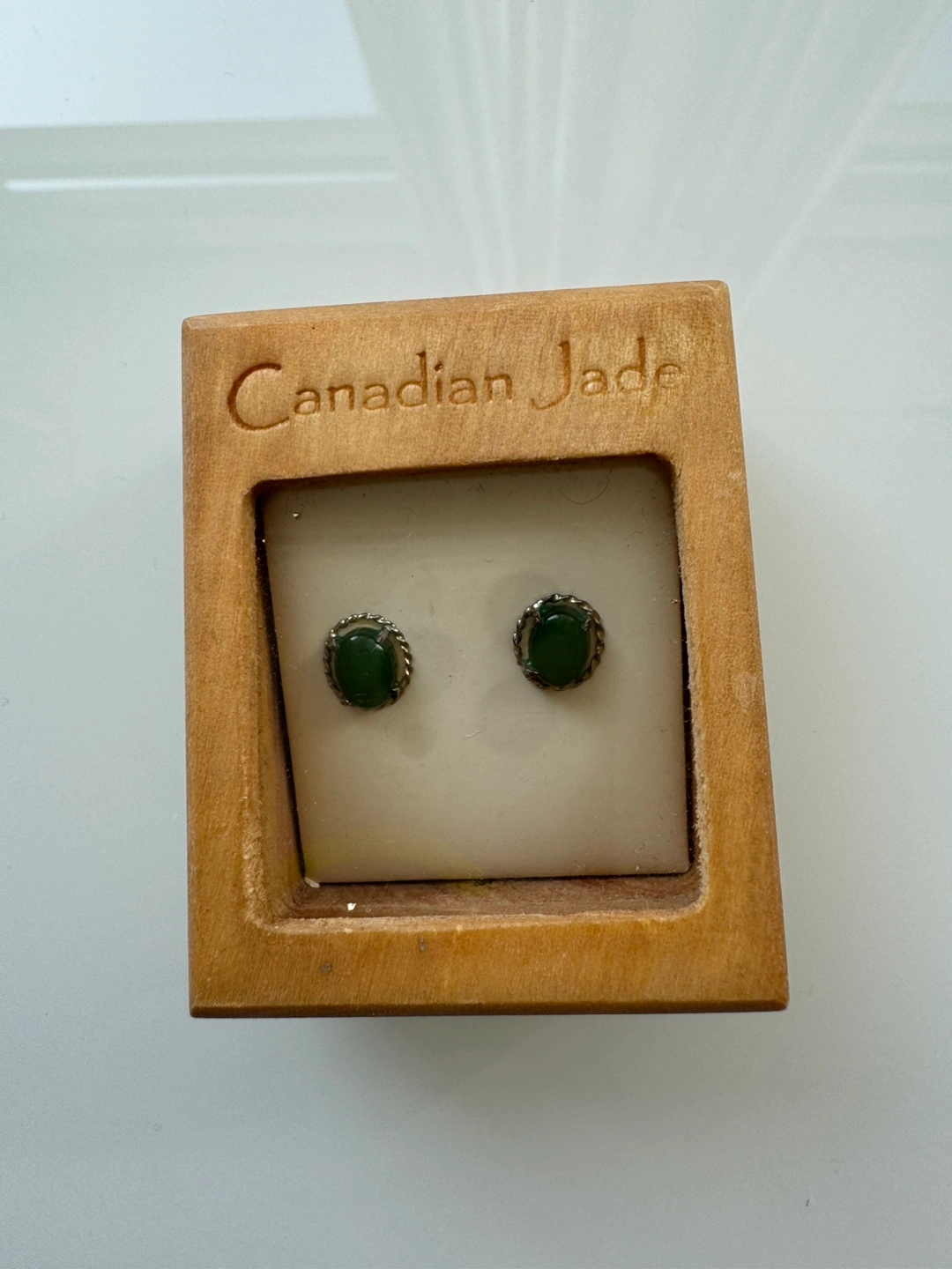 A pair of earrings with Canadian Jade. Gold plated outer rim and sterling silver. Comes with the original box.