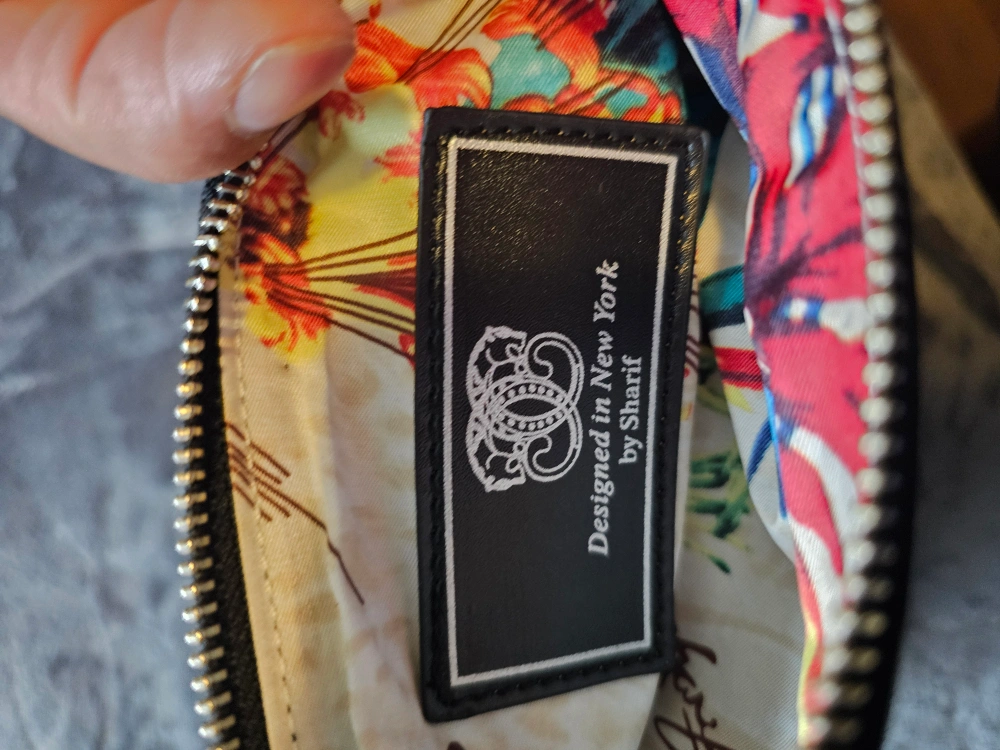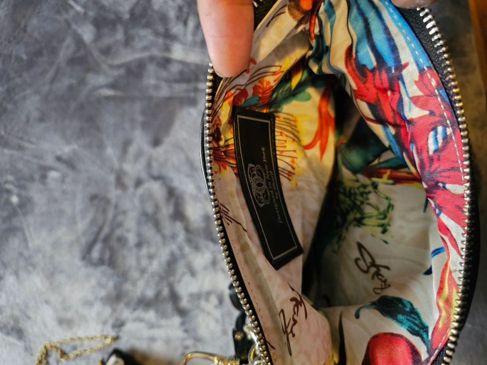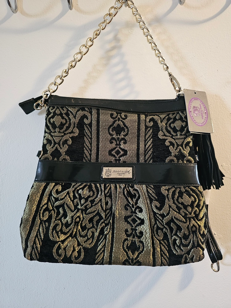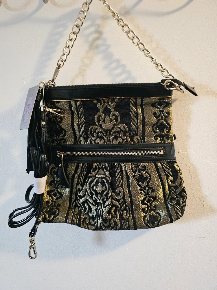 A beautiful handbag, with a gold and black floral pattern. Features a metal chain strap and a detachable shoulder strap. The inside lining has a colourful design, and there is a tag attached. This bag could be perfect for carrying around your essentials while you are out and about, taking some time for yourself.