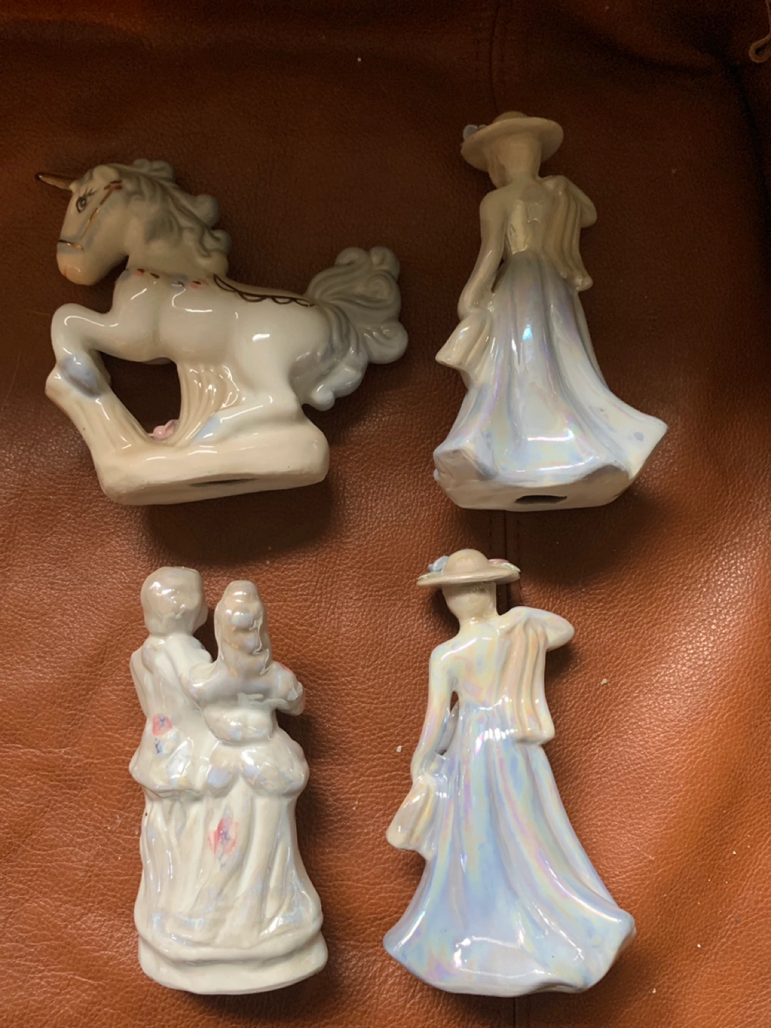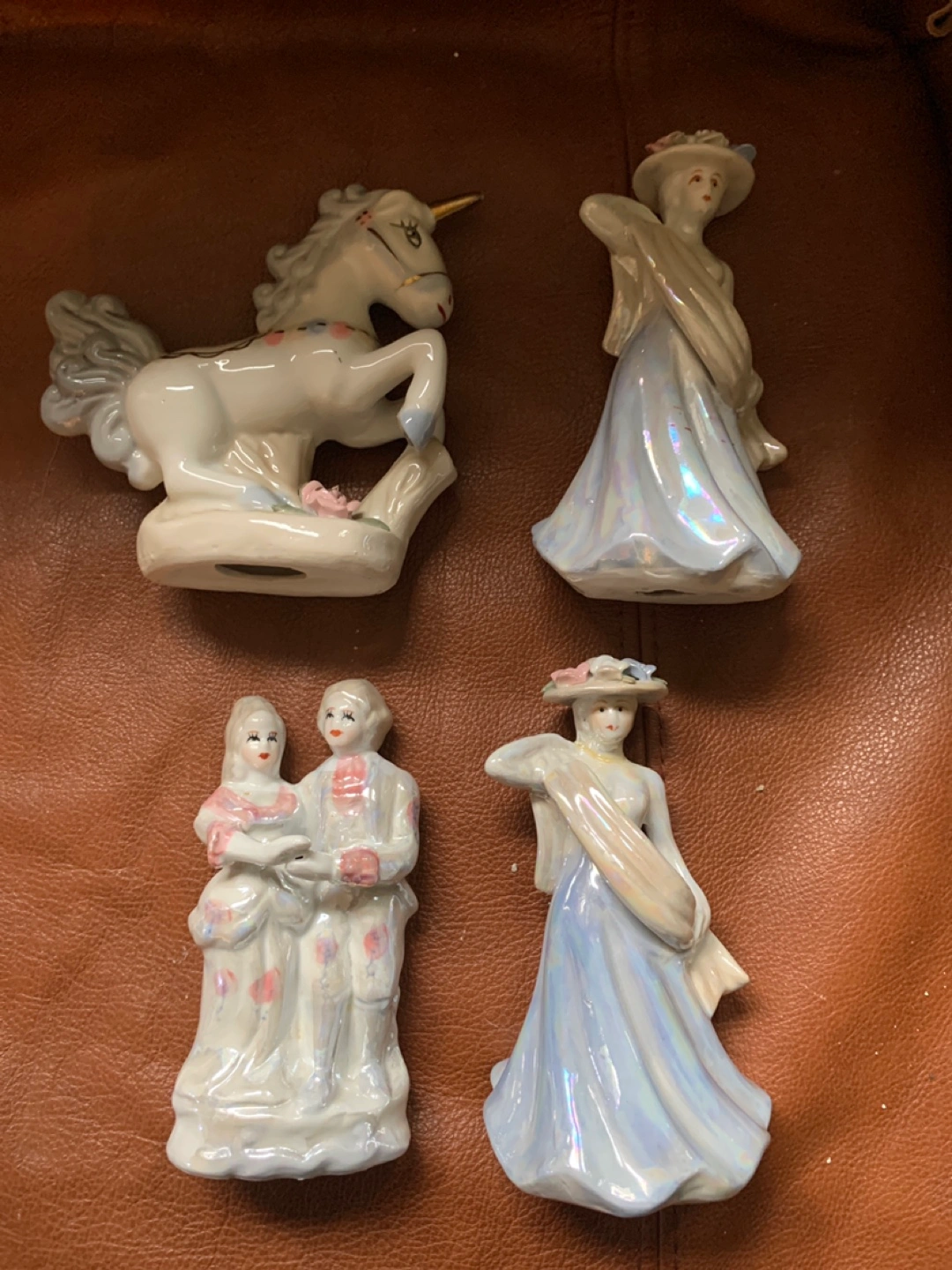 A set of four porcelain figurines. Includes a unicorn, two ladies Pickup asap