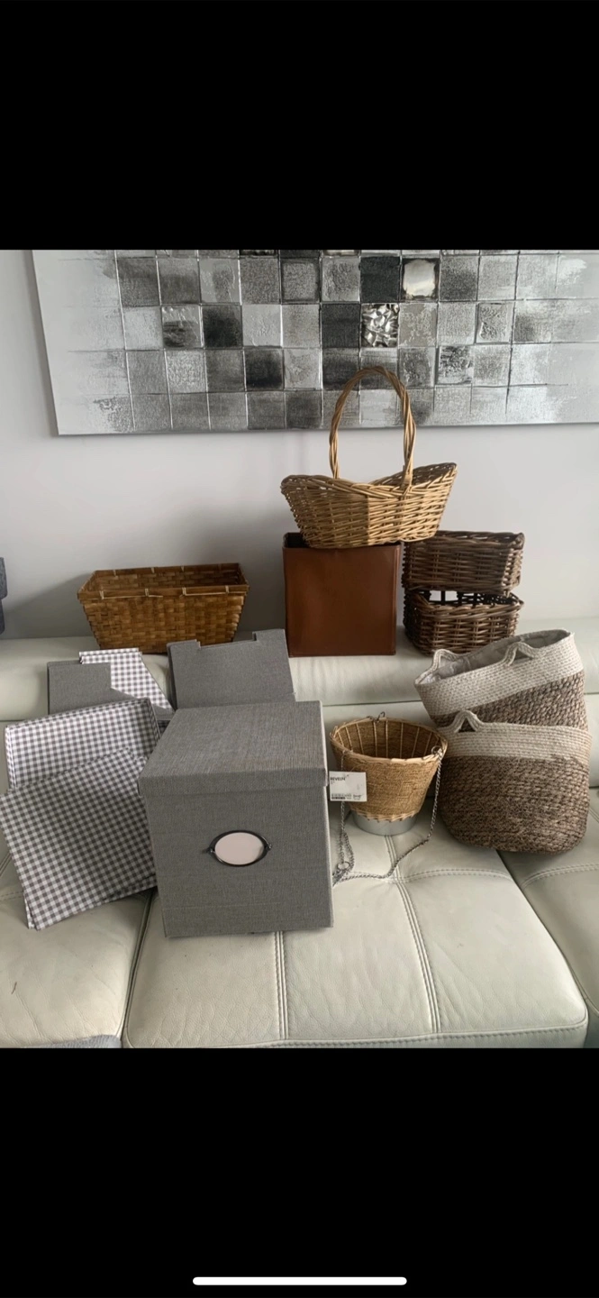 Pricing from $8 up. See down below ⬇️ Fabrics, Wicker, Faux-leather. *Each item ❗️Each item is numbered on pic #2, let me know the #s you are interested in. #1- Grey fabric storage cubes (3): Ikea, “Kvernvik” model, foldable, super cute designs inside and on the front handle. Buy 1 for $10 Buy 2 for $18 Buy 3 for $25 #2- Med/large rectangular 17”W wicker basket: $8, Micheals. #3- Faux-leather tan basket/cube: $8, foldable. #4- Gold oval-shaped 17”W/15”H wicker basket w/ handle: $8, Micheals. #5- SOLD-Set of 2 rectangular darker wicker baskets: $12, Pottery Barn. #6- Set of 2 wicker/bamboo cream/grey planter baskets: $12, water plastic retainer/protector on the inside. #7- Wicker/metal 9”W hanging planter: $12, Ikea, discontinued “Revens” model. Pick-up n cash only. No holds, first come first serve. Prefer same day pick-up. Map on listing. Thx! 💛Look at my listings for great bundle discounts.