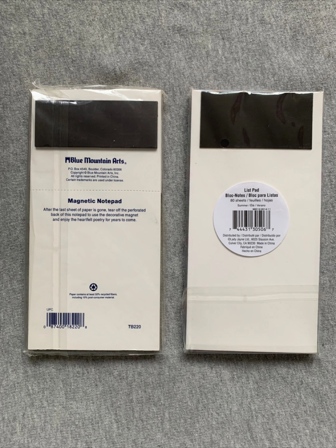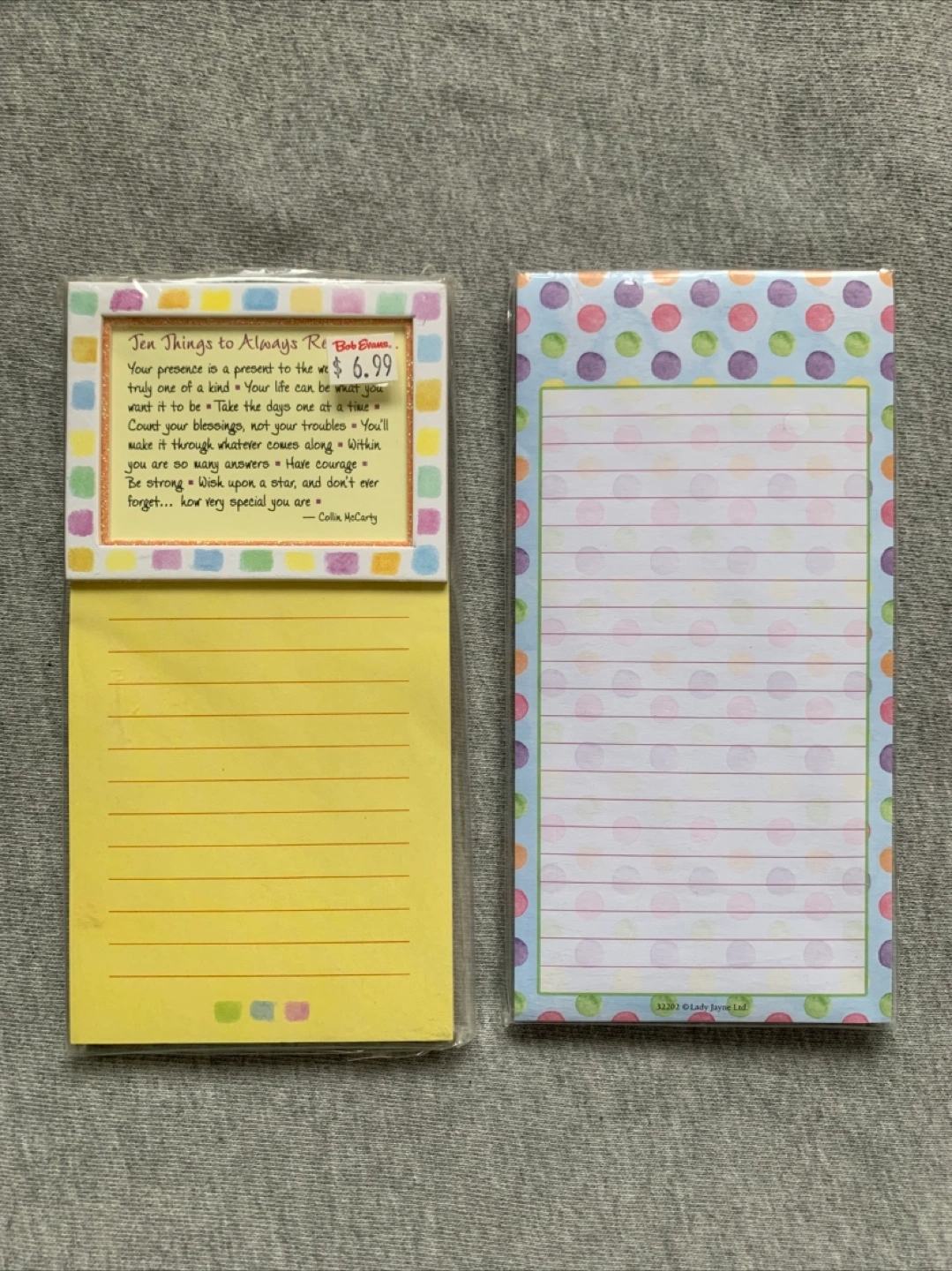 $5 each Two list pads, each with a unique design. One is yellow with writing space. The other is covered in pastel coloured polka dots. Brand New in sealed packaging. Apparently purchased at Bob Evans lol Yellow one becomes a decorative magnet with poetry when the 80 sheets are used. Great to keep on the fridge for handy lists/notes.
