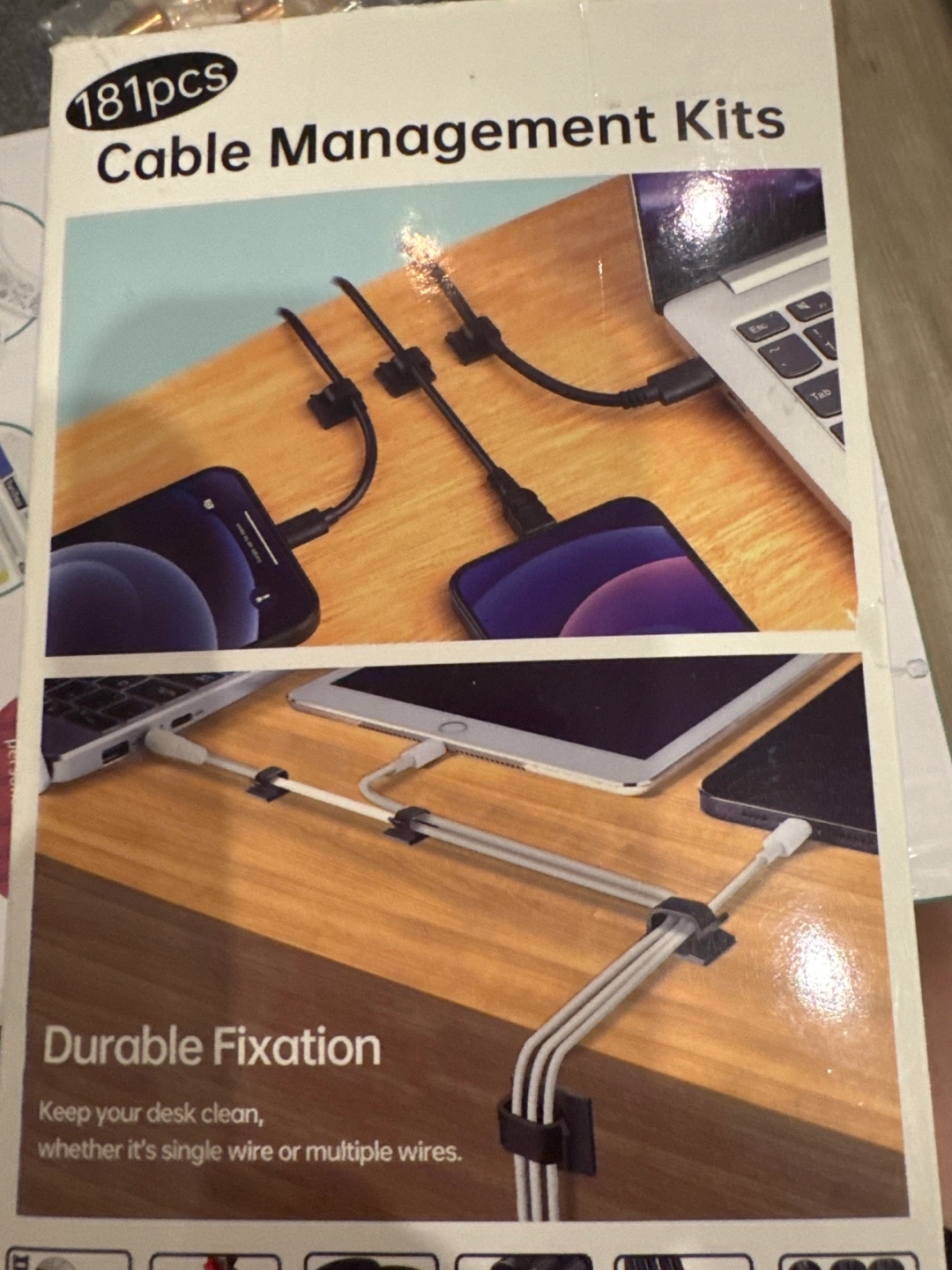 This kit helps keep your desk tidy. The box advertises 181 pieces. Comes with everything shown on the box, great for someone who likes to keep a clean workspace.