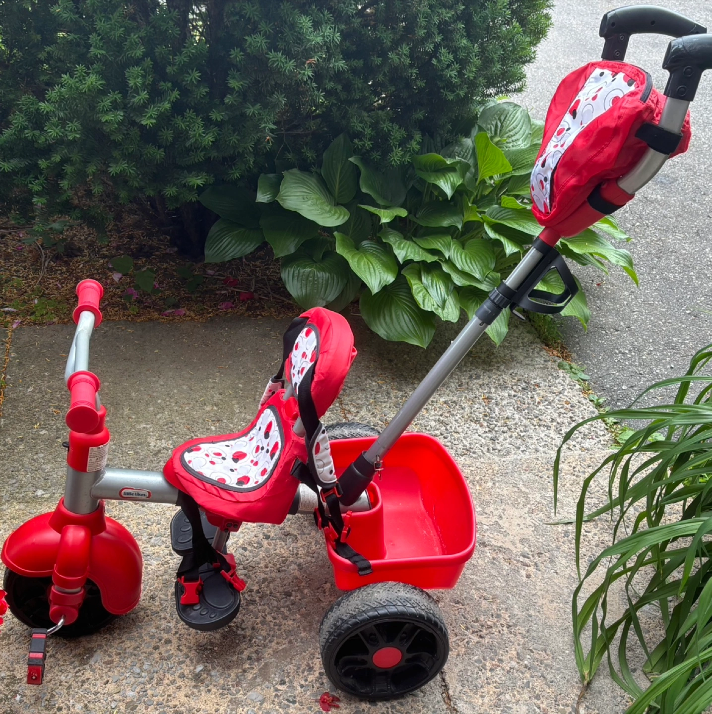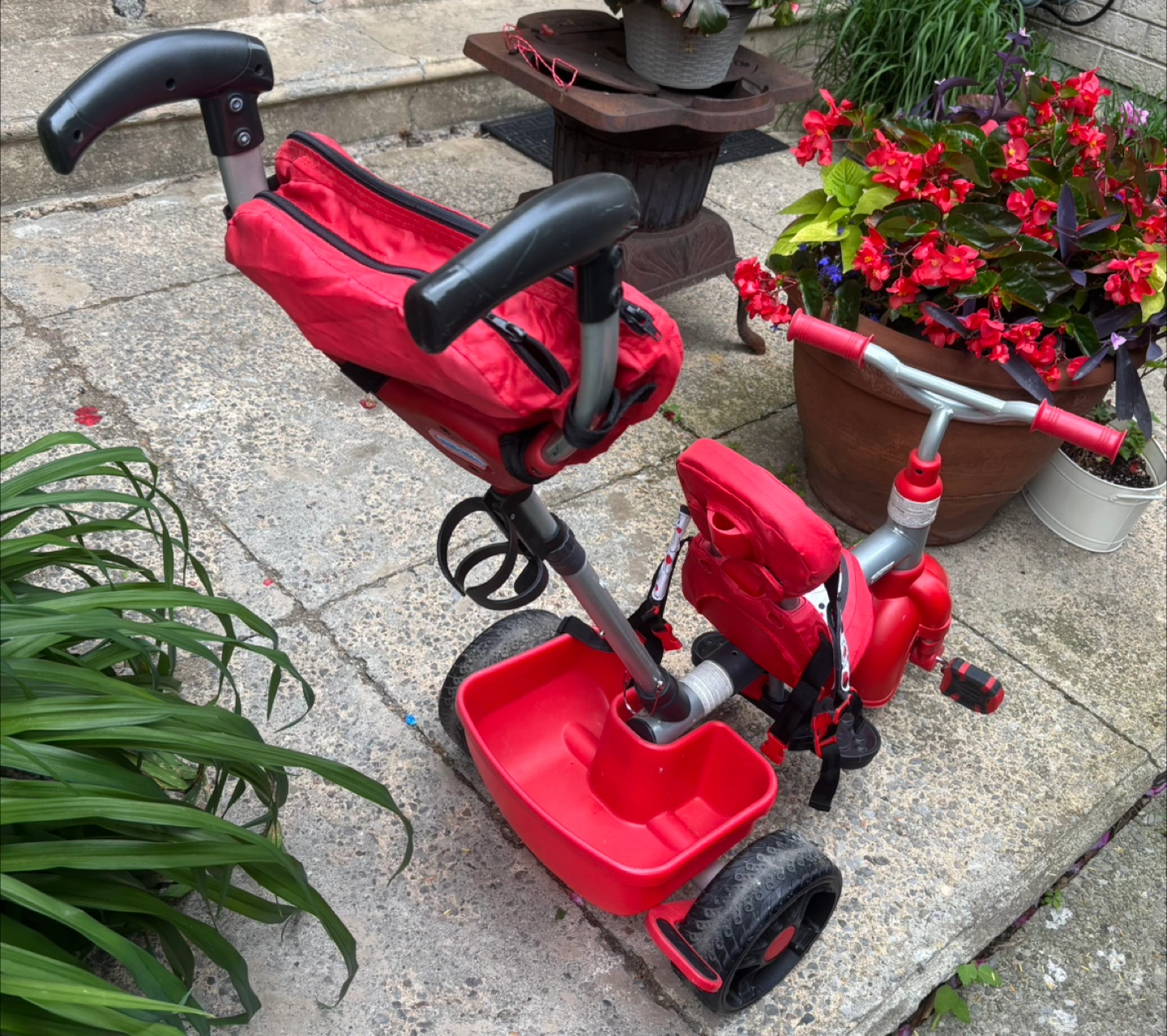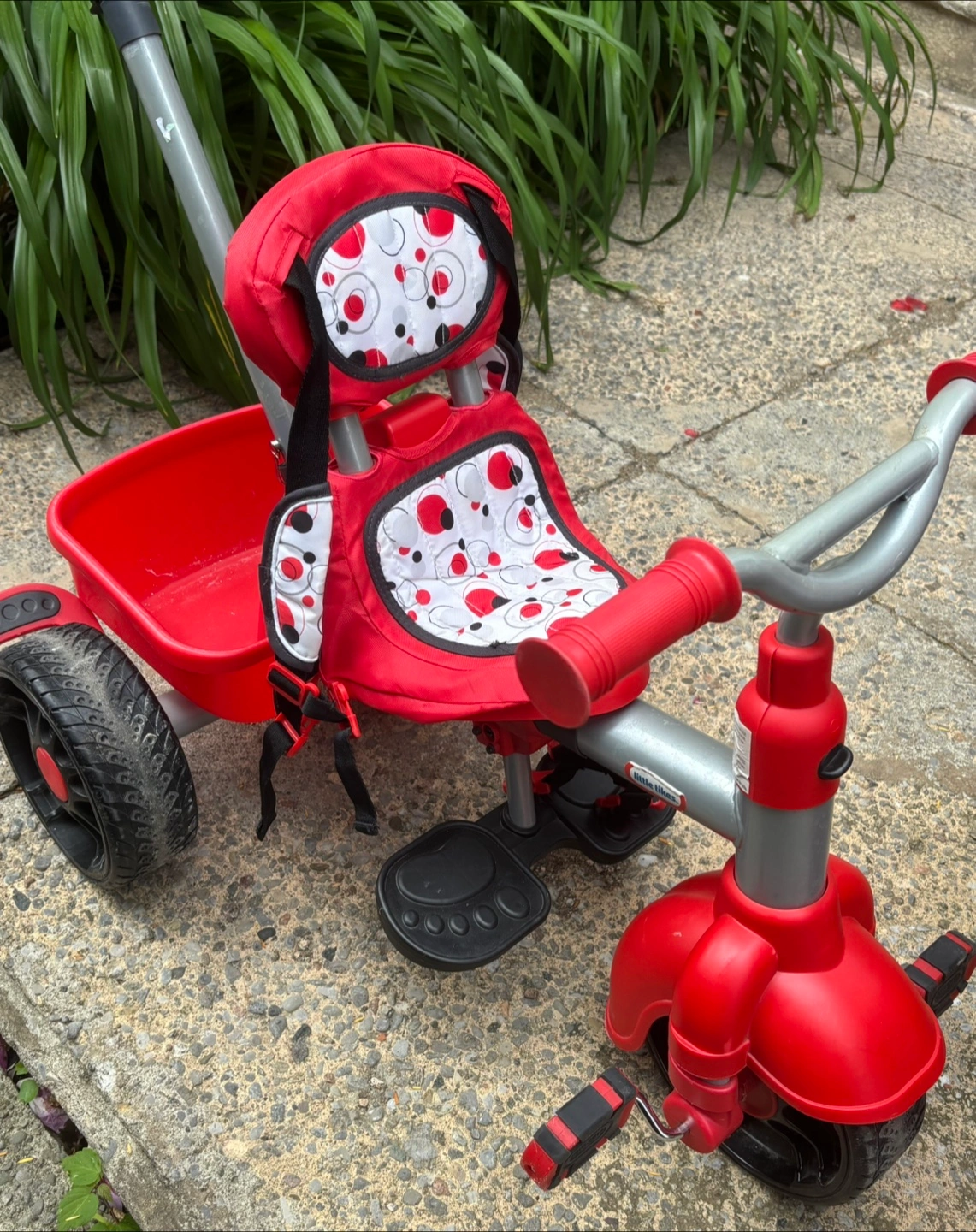 Selling a Little Tikes 4-in-1 Trike in red! It's in great condition and ready for a new little rider. Perfect for kids as they grow, offering different stages of use. It also has a convenient storage bucket and a parent handle for easy steering