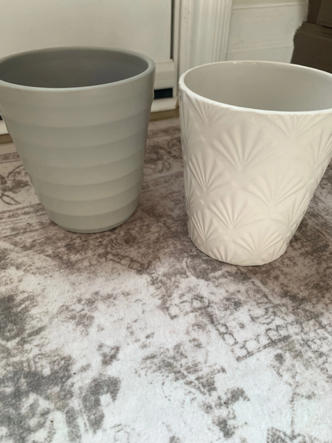 Giving away two flower pots! One is light grey with horizontal ridges, and the other is off-white with a leaf-like pattern. They're both in great condition and ready to add some charm to your plants