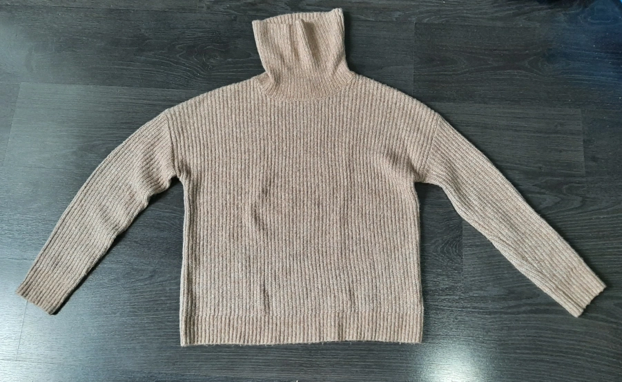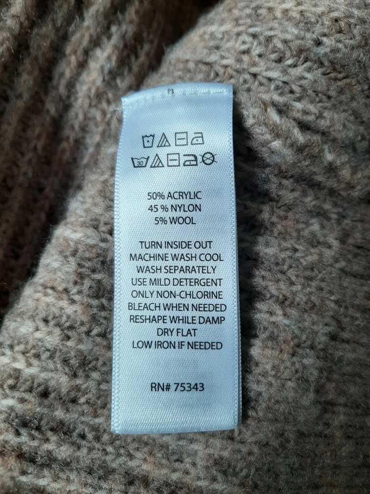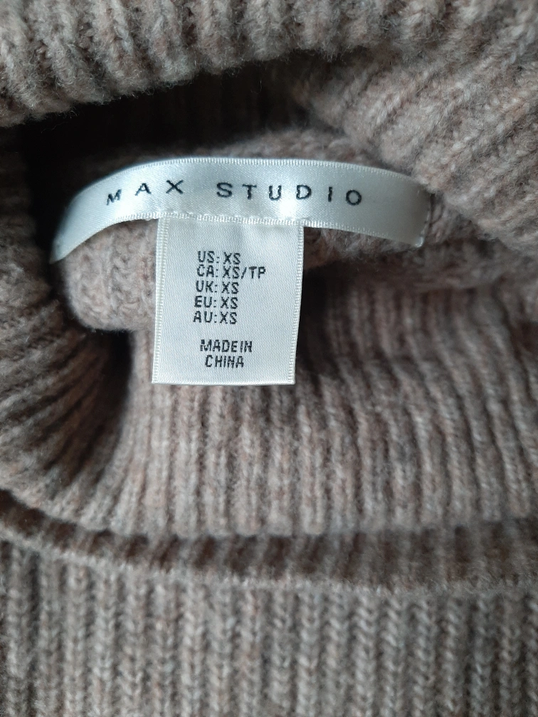 Cozy Max Studio turtleneck sweater in size XS. The material is 50% acrylic, 45% nylon, and 5% wool. Perfect for staying warm and stylish!