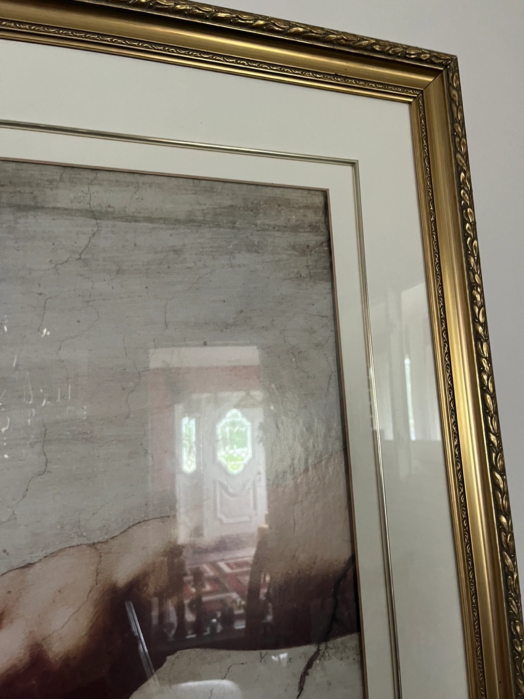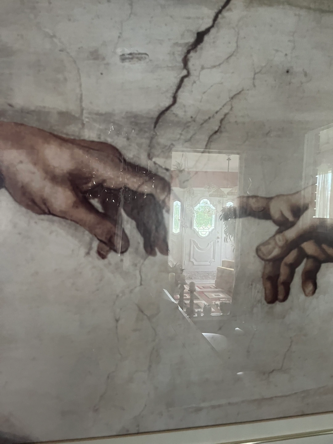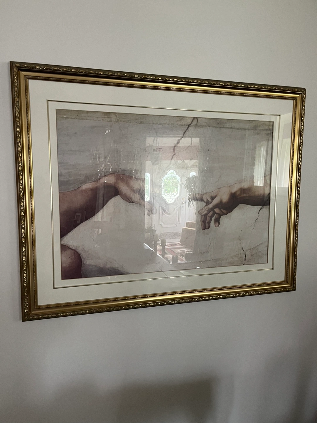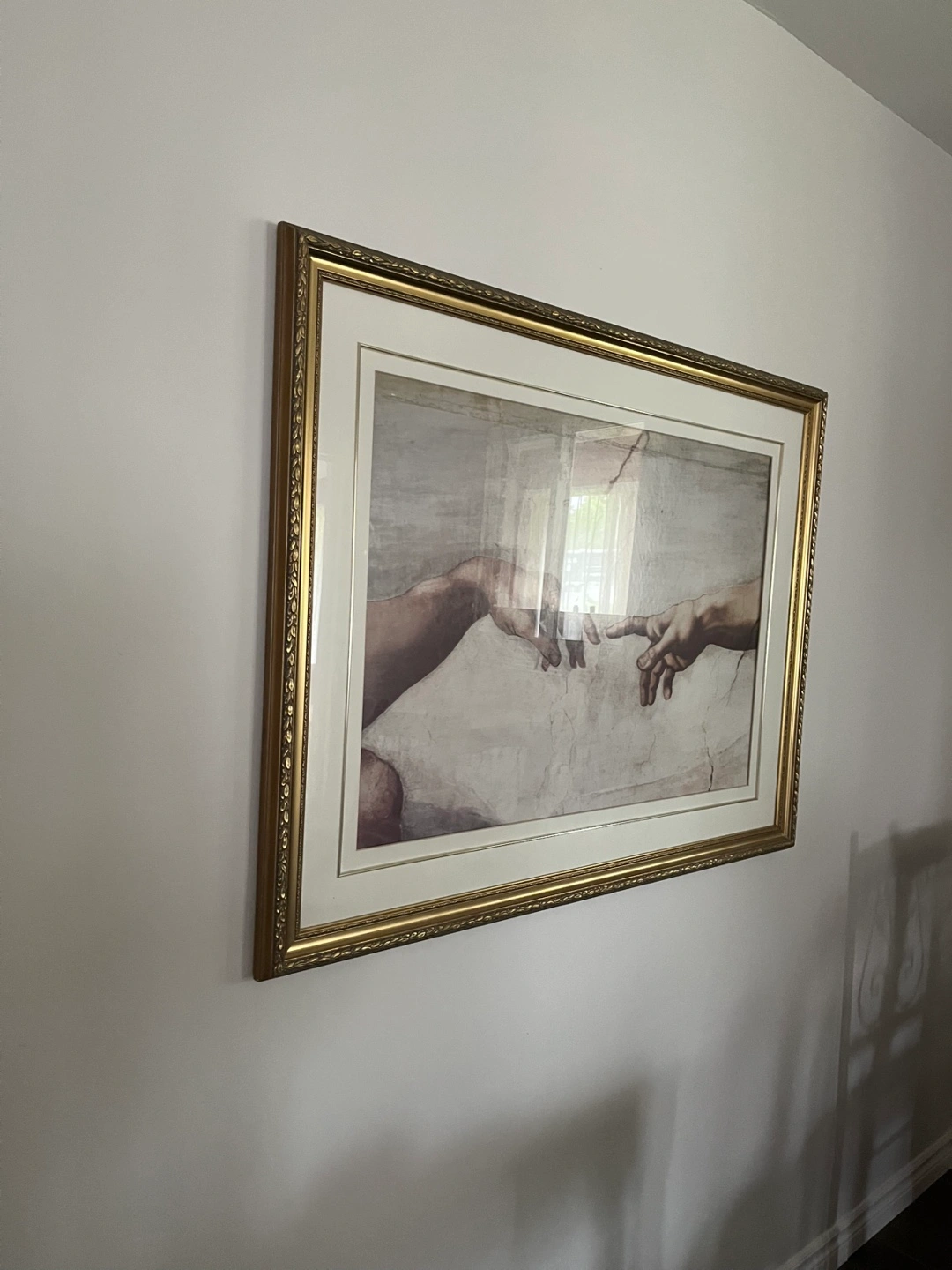 Selling a framed art print featuring Michelangelo's "The Creation of Adam". The frame is a lovely gold colour.