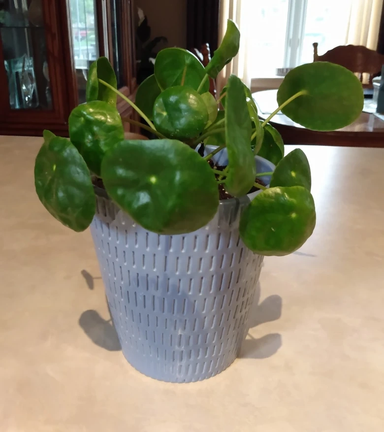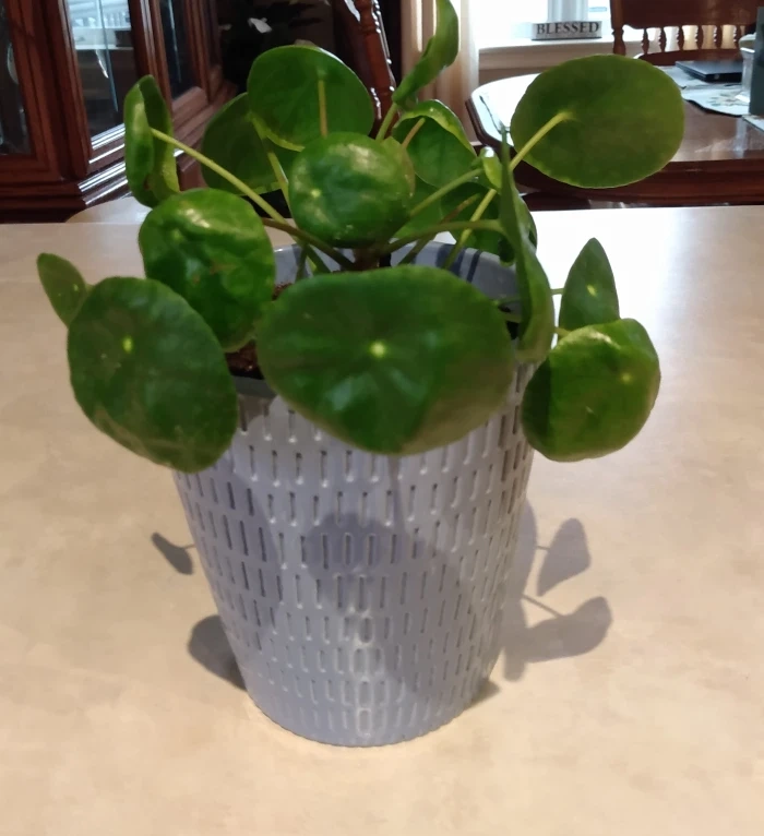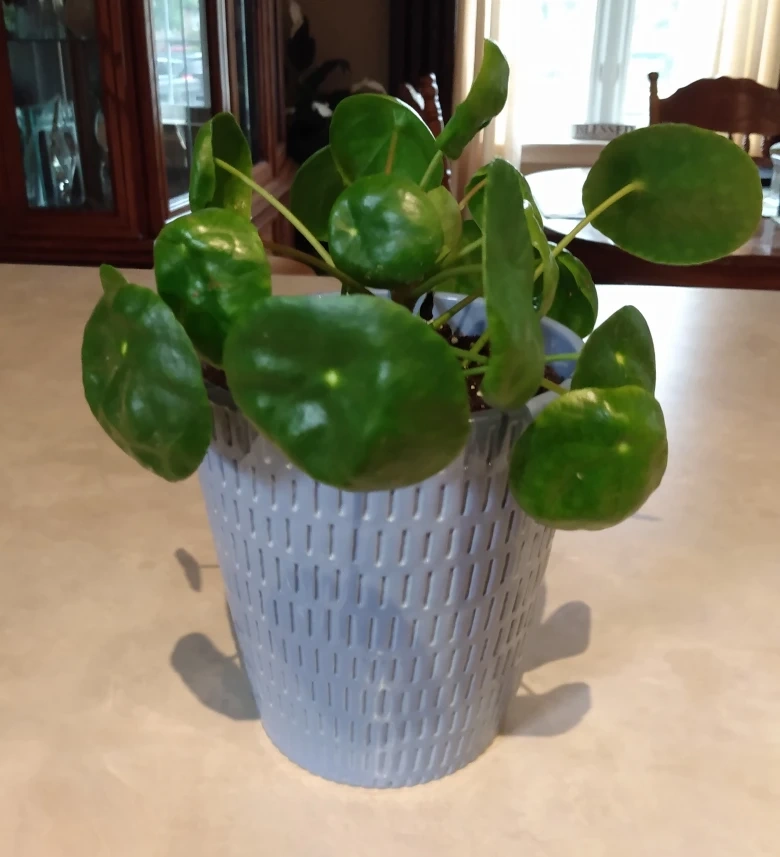 I'm selling a healthy Pilea peperomioides, also known as a Chinese money plant or pancake plant. It comes in a cute blue pot and is ready to brighten up your space!