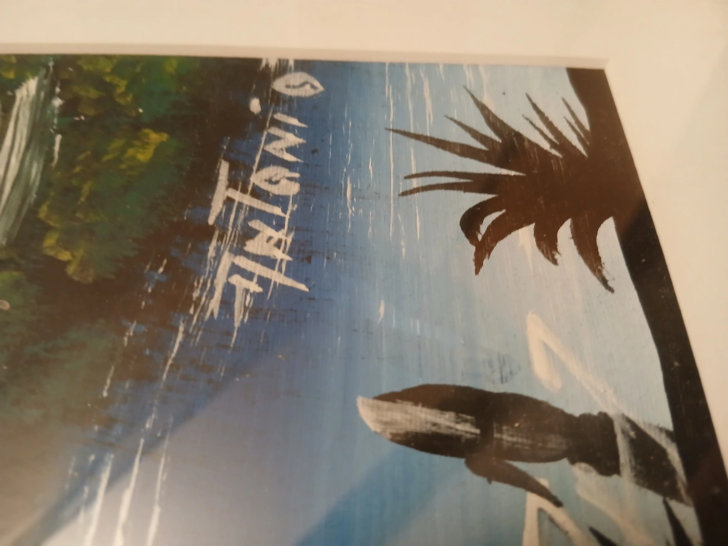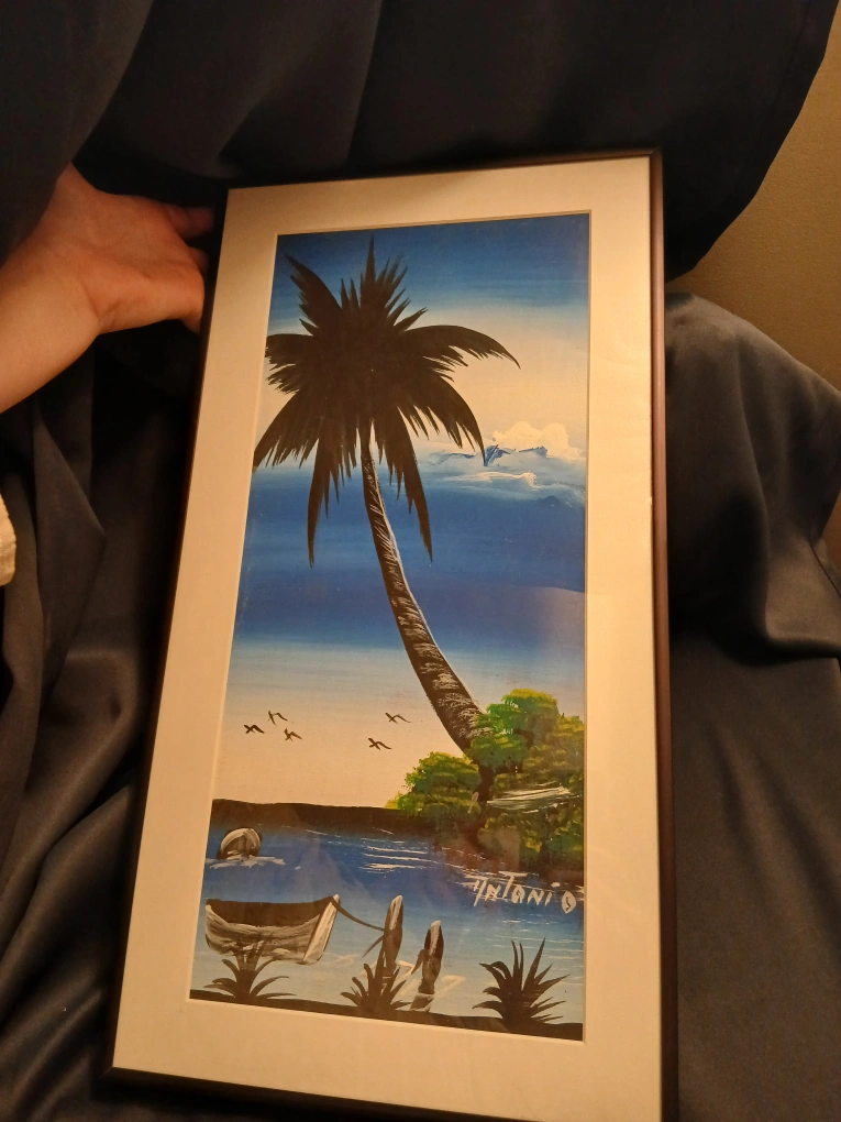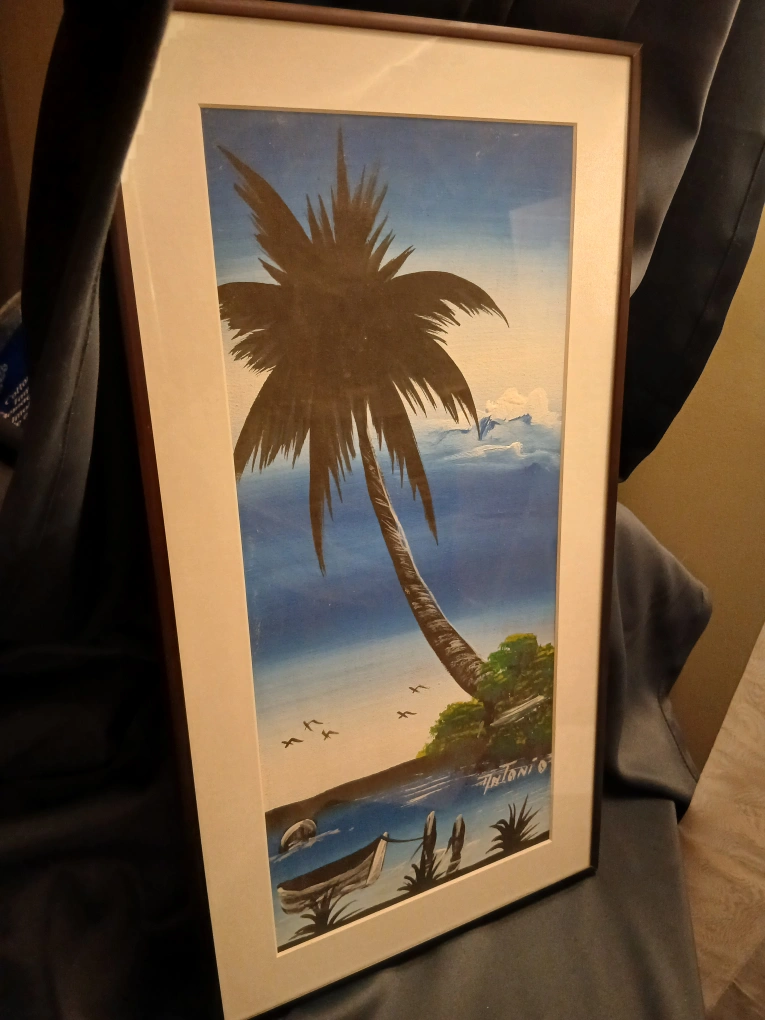 A framed painting with a palm tree scene. It's signed by the artist, 'Antonio'. Ready to add a tropical touch to your space! Framed and matted by Humber frames, Toronto.