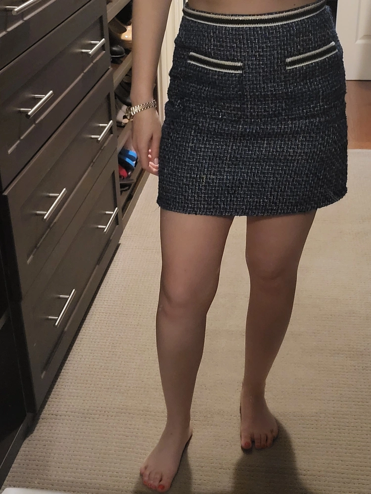 Selling a cute mini skirt made of a lovely blue tweed material! It's in great condition and perfect for adding a touch of style to your wardrobe. The skirt is a size small and has a classic, flattering cut! Feel free to ask any questions