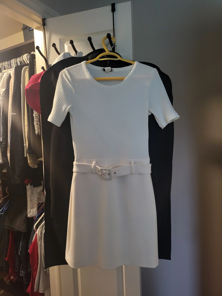 Here's a cute white mini dress with a belt! It's perfect for a night out or a casual day. The dress is in great condition and ready for a new home